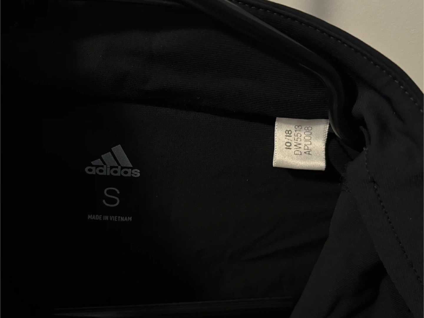 This is an Adidas black zip-up jacket. It's a size small and made in Vietnam. It has zippered pockets.