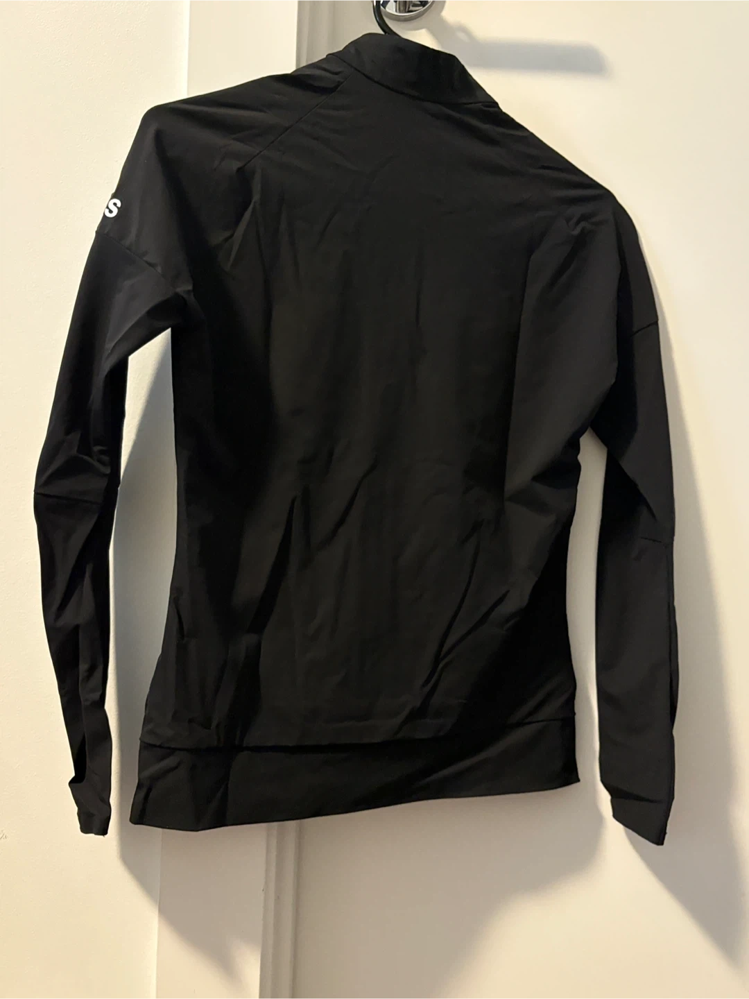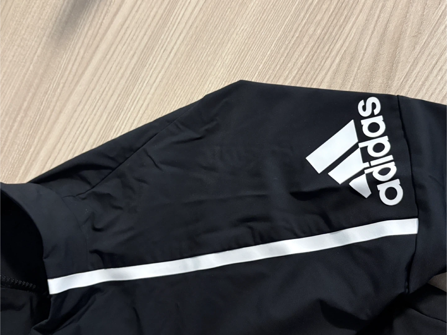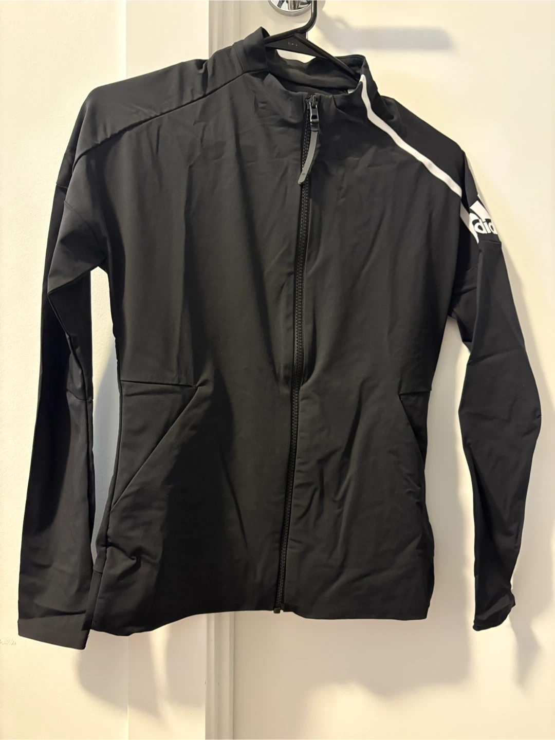 This is an Adidas black zip-up jacket. It's a size small and made in Vietnam. It has zippered pockets.