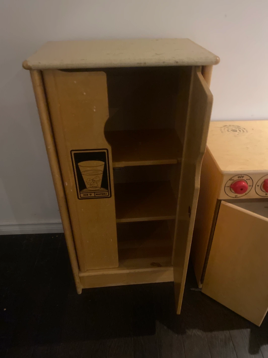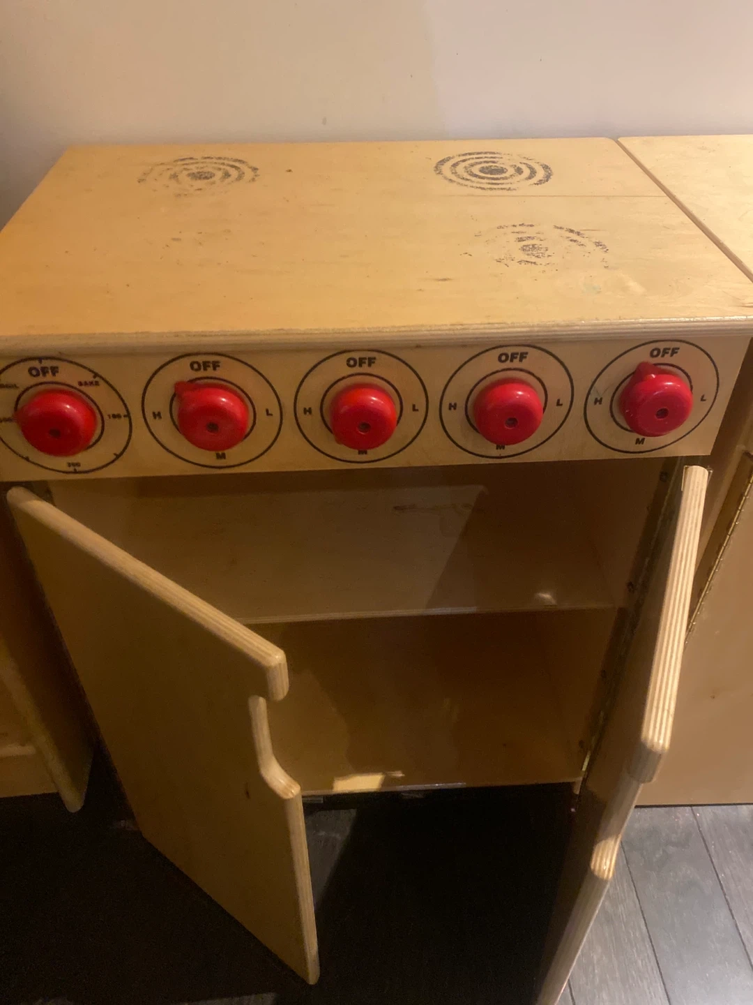 Used solid wood play kitchen set with a fridge, sink and stove features. It's made of natural wood and includes red knobs for the stove. The set has a cupboard and a cabinet for storage. Great for imaginative play! Daycare approved.