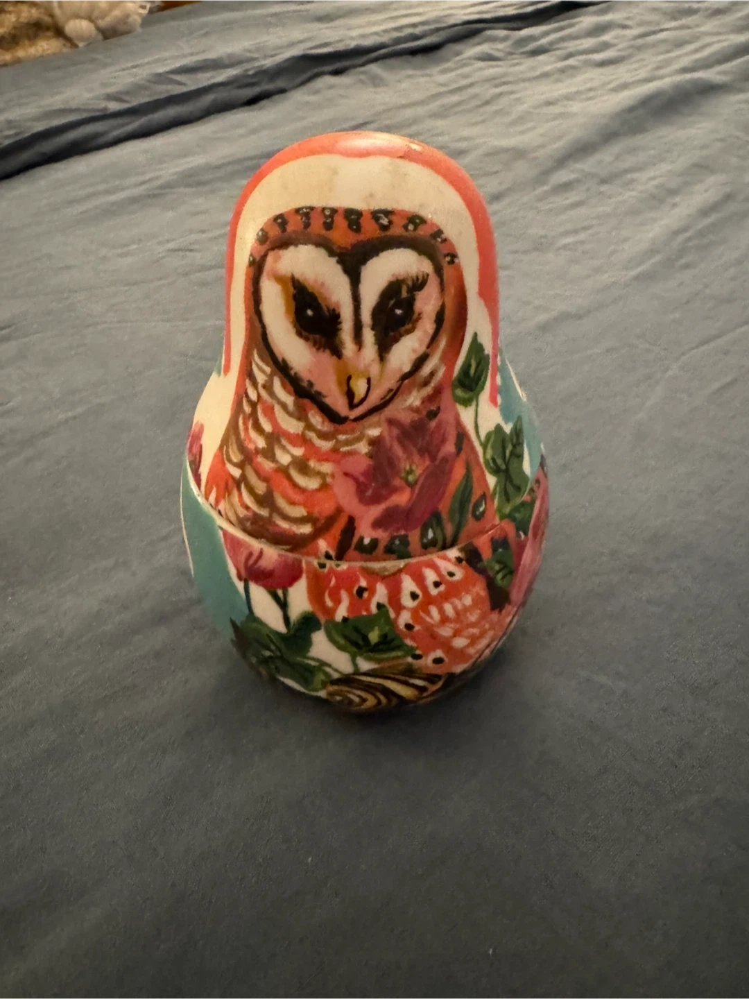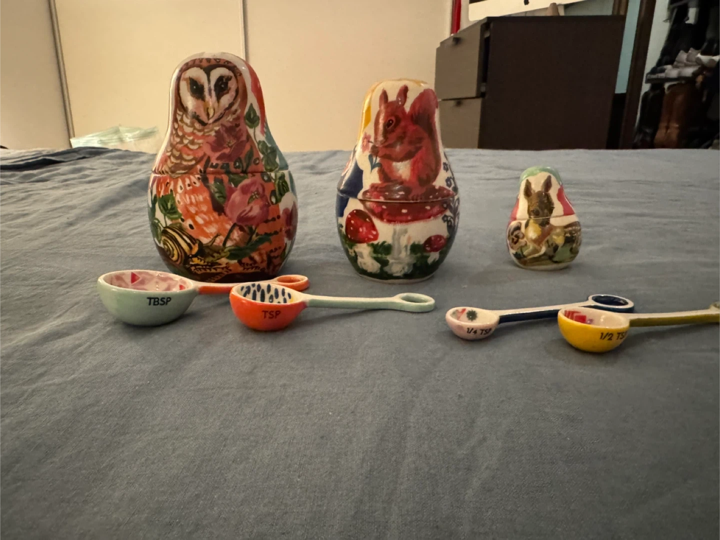 Set of nesting decorative measuring cups and spoons. Features a matryoshka doll style with owl and squirrel designs. Includes measuring cups for 1 cup, 1/2 cup, 1/3 cup, and 1/4 cup. Also includes spoons marked T BSP, 1/2 TSP, and 1/4 TSP. These would be lovely for display or gentle kitchen use!
