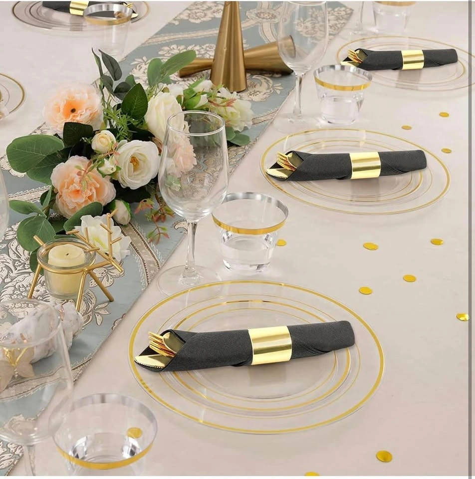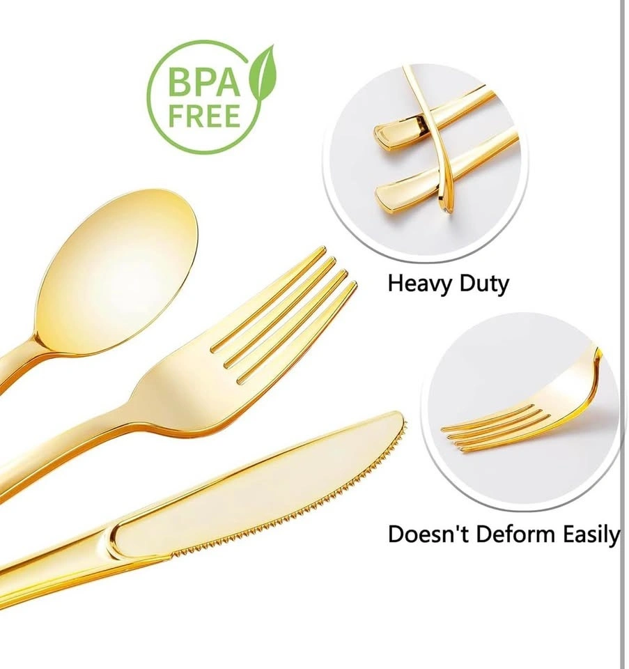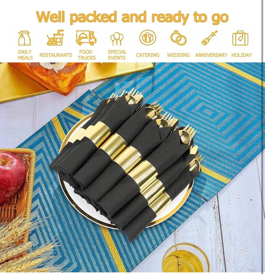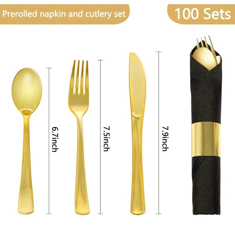 This is a 100-pack of pre-rolled gold plastic silverware sets, each including a fork, spoon, and knife, along with a black napkin. They are made from food-grade, BPA-free plastic and are designed to be sturdy and durable. The elegant gold finish gives them a metallic look, perfect for adding a touch of class to any event. They are disposable for easy cleanup, but can also be washed by hand for reuse. Not recommended for microwave, oven, or dishwasher use. Great for parties, weddings, banquets, holidays, picnics, and everyday meals. Let me know if you're interested!
