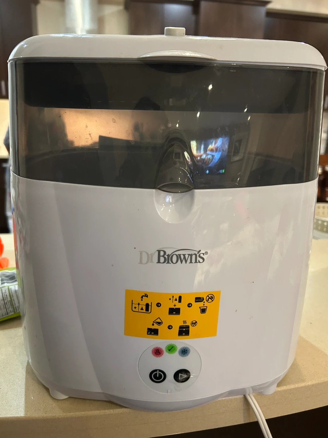 Dr. Brown's electric steam sterilizer for baby bottles and accessories. It effectively steams and sanitizes up to 6 bottles at a time. Sterilizes items in about 12 minutes.