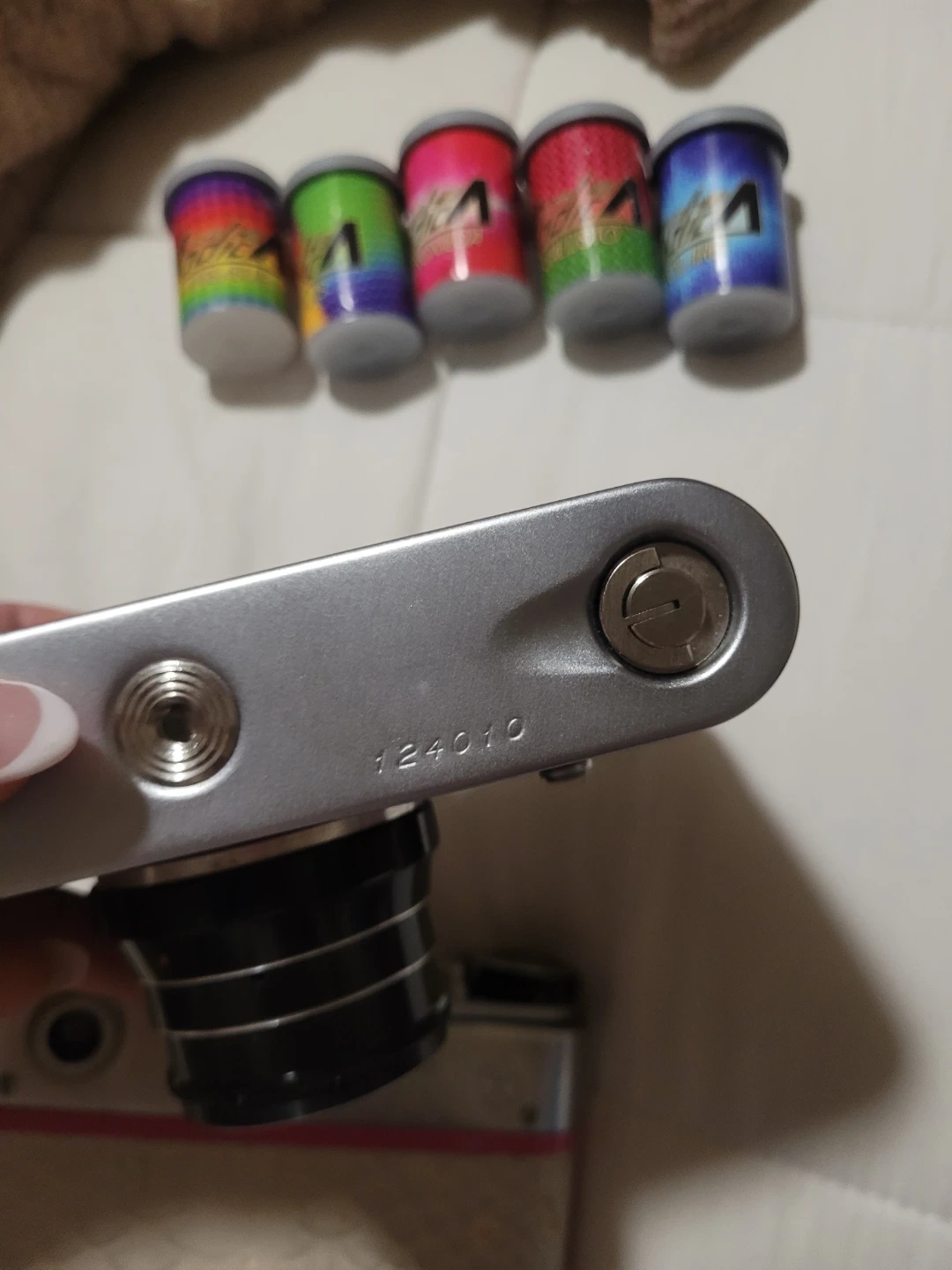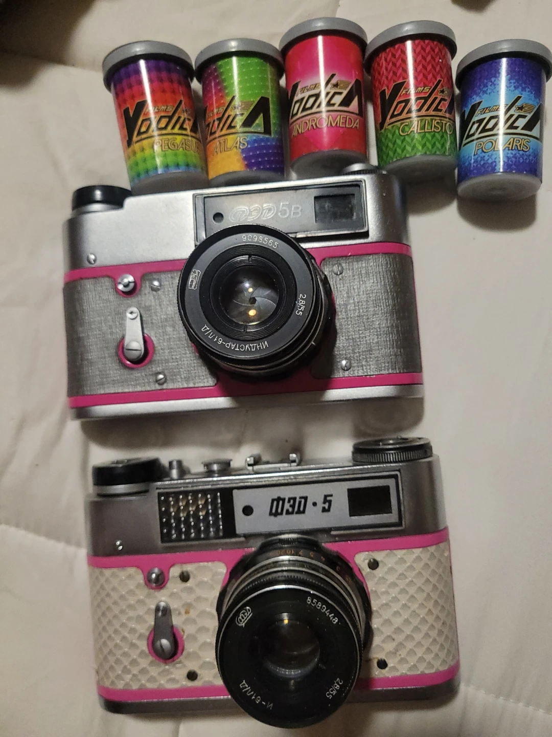 Two 35mm film cameras, both manufactured in the USSR. They have pink accents and come with lenses. Includes five rolls of VODICA film, including Andromeda, Callisto, and Polaris.