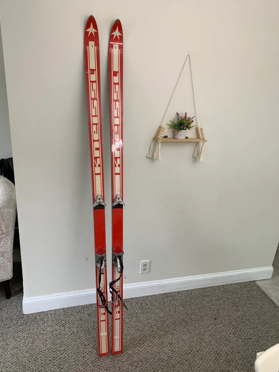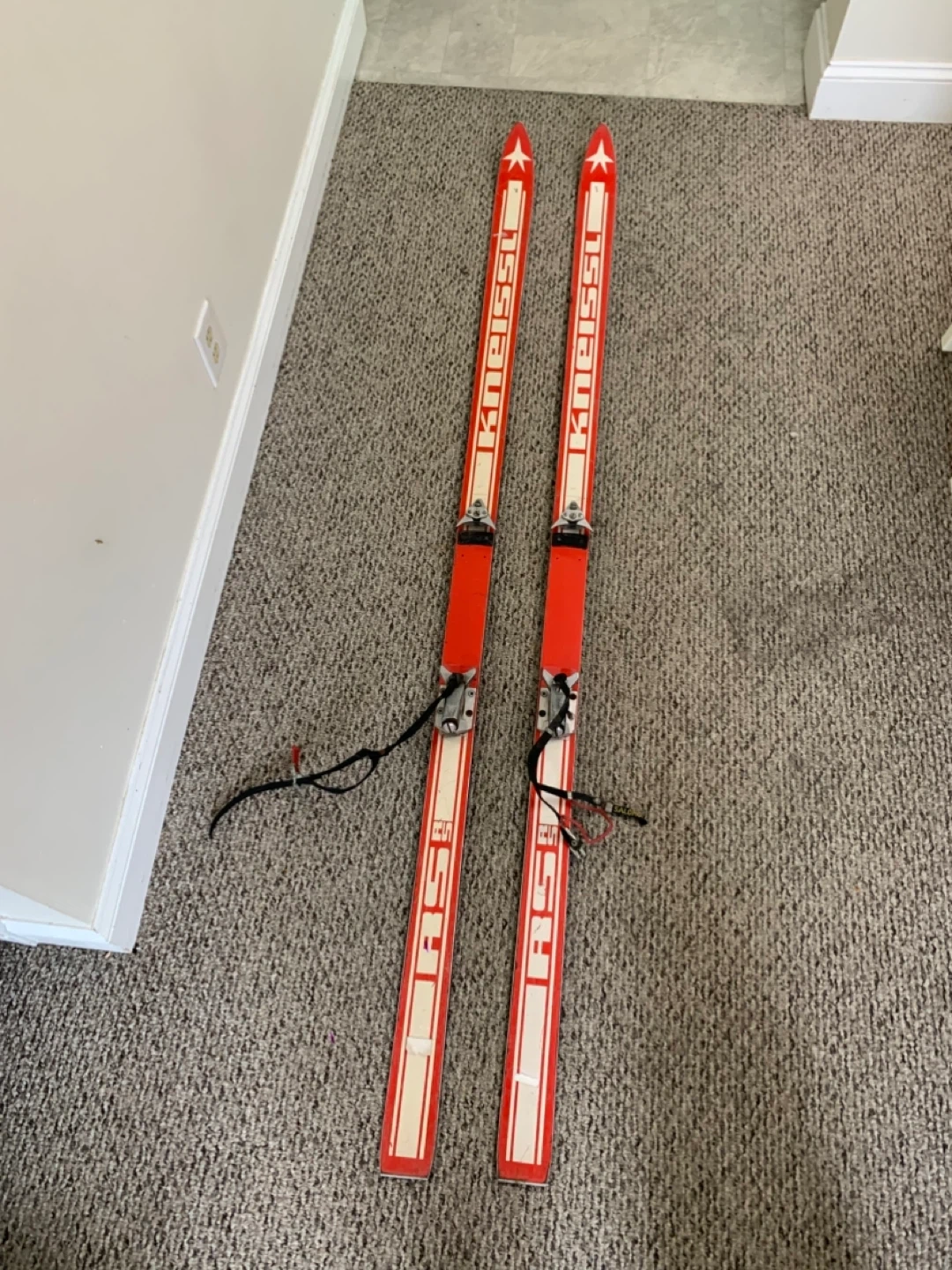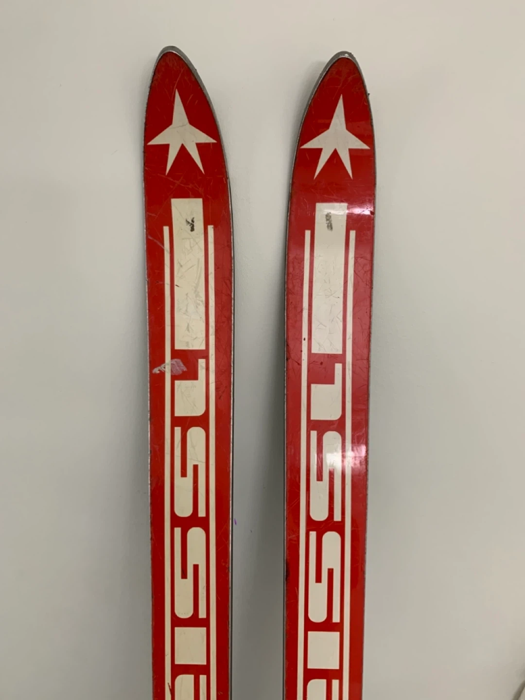 Vintage red skis from Kneissl, featuring the iconic Red Star RS design. These skis come with bindings already attached. Perfect for display or retro skiing enthusiasts!