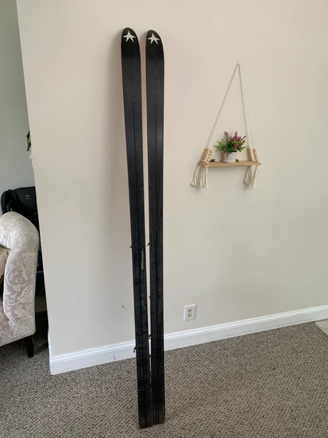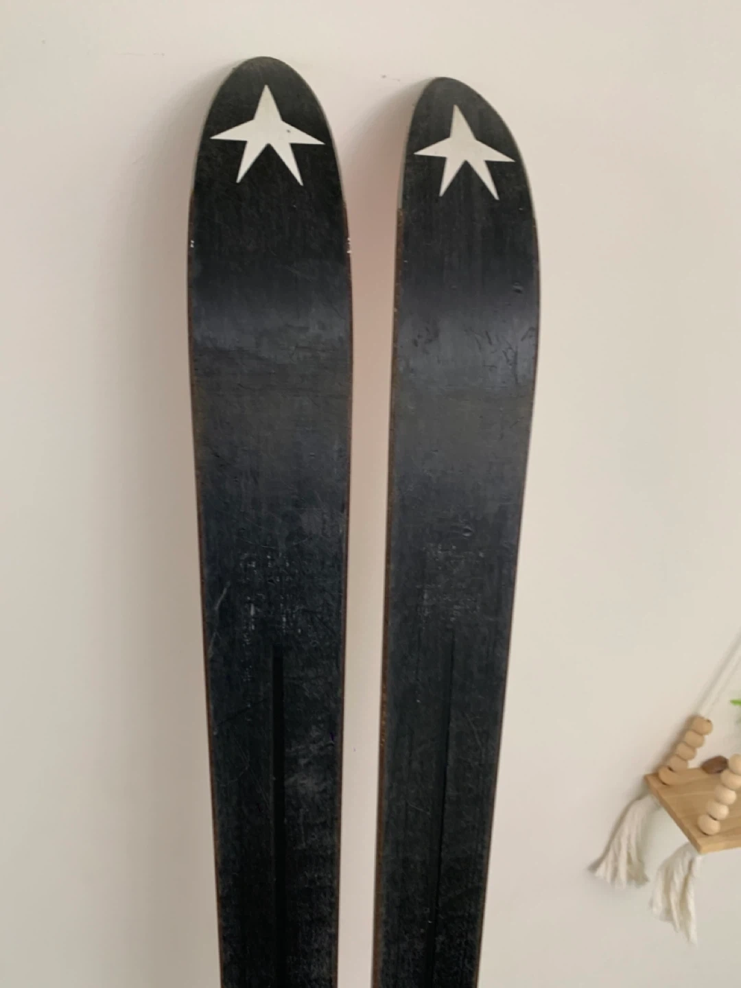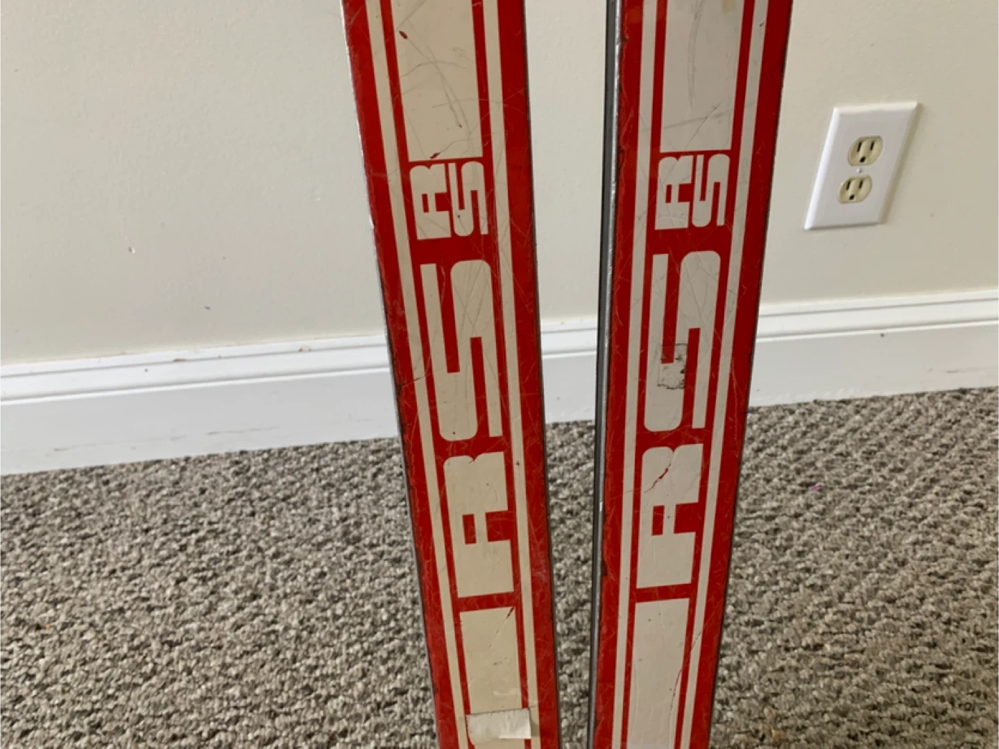 Vintage red skis from Kneissl, featuring the iconic Red Star RS design. These skis come with bindings already attached. Perfect for display or retro skiing enthusiasts!