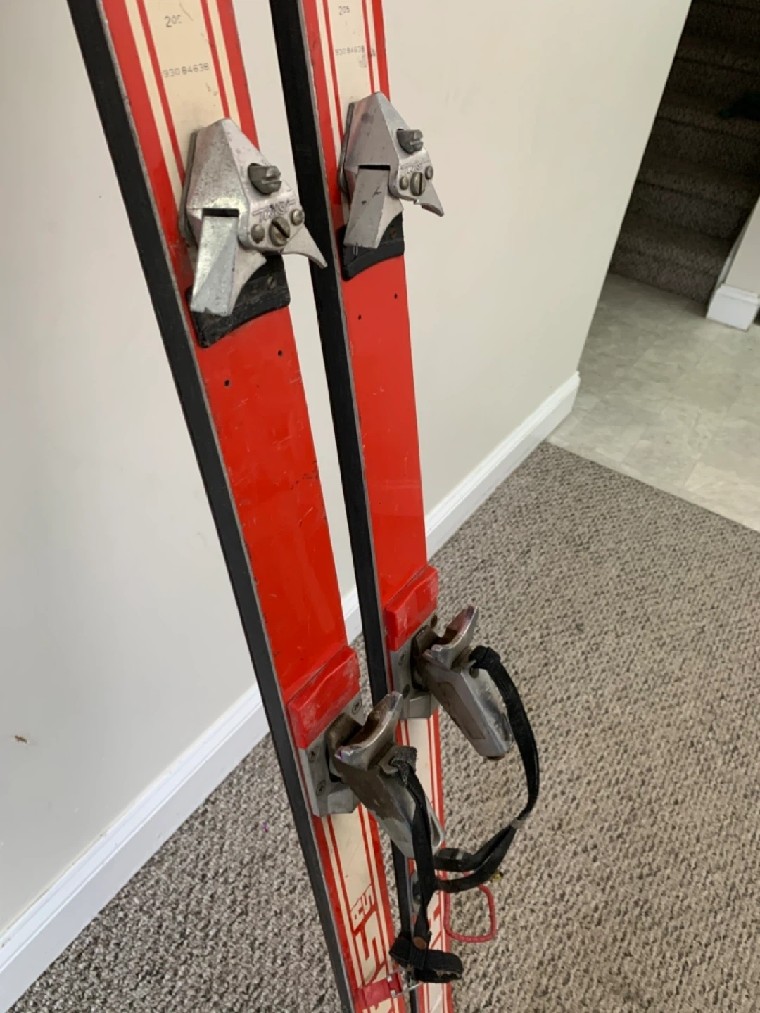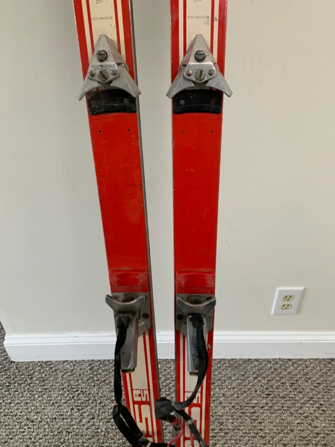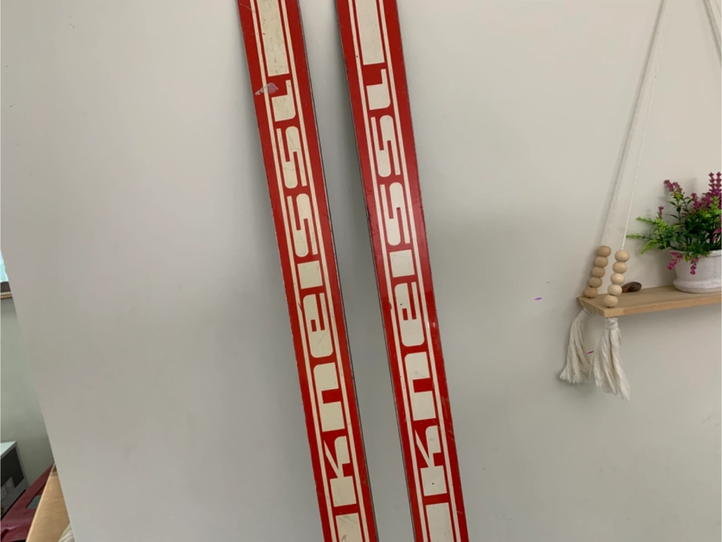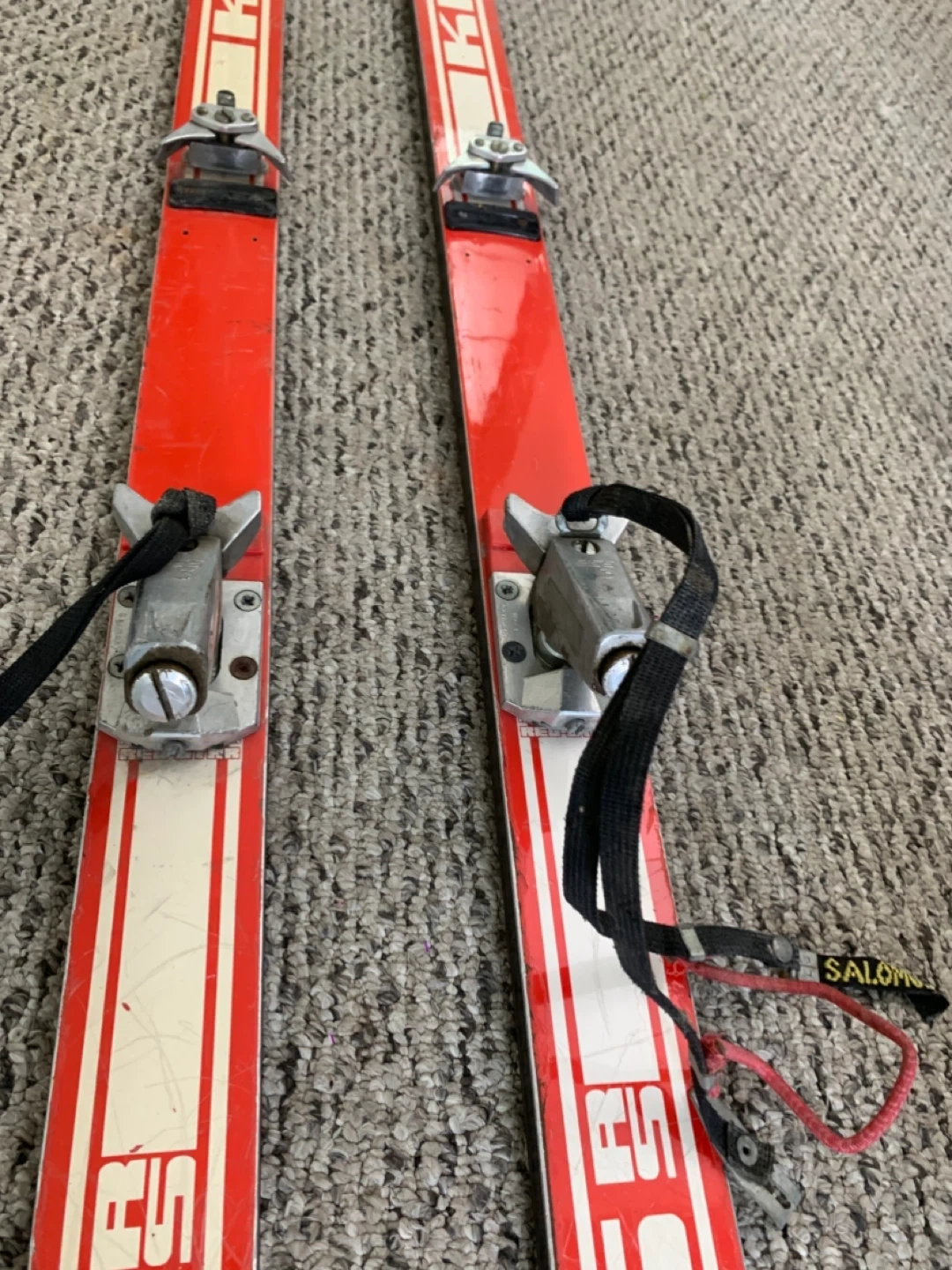 Vintage red skis from Kneissl, featuring the iconic Red Star RS design. These skis come with bindings already attached. Perfect for display or retro skiing enthusiasts!