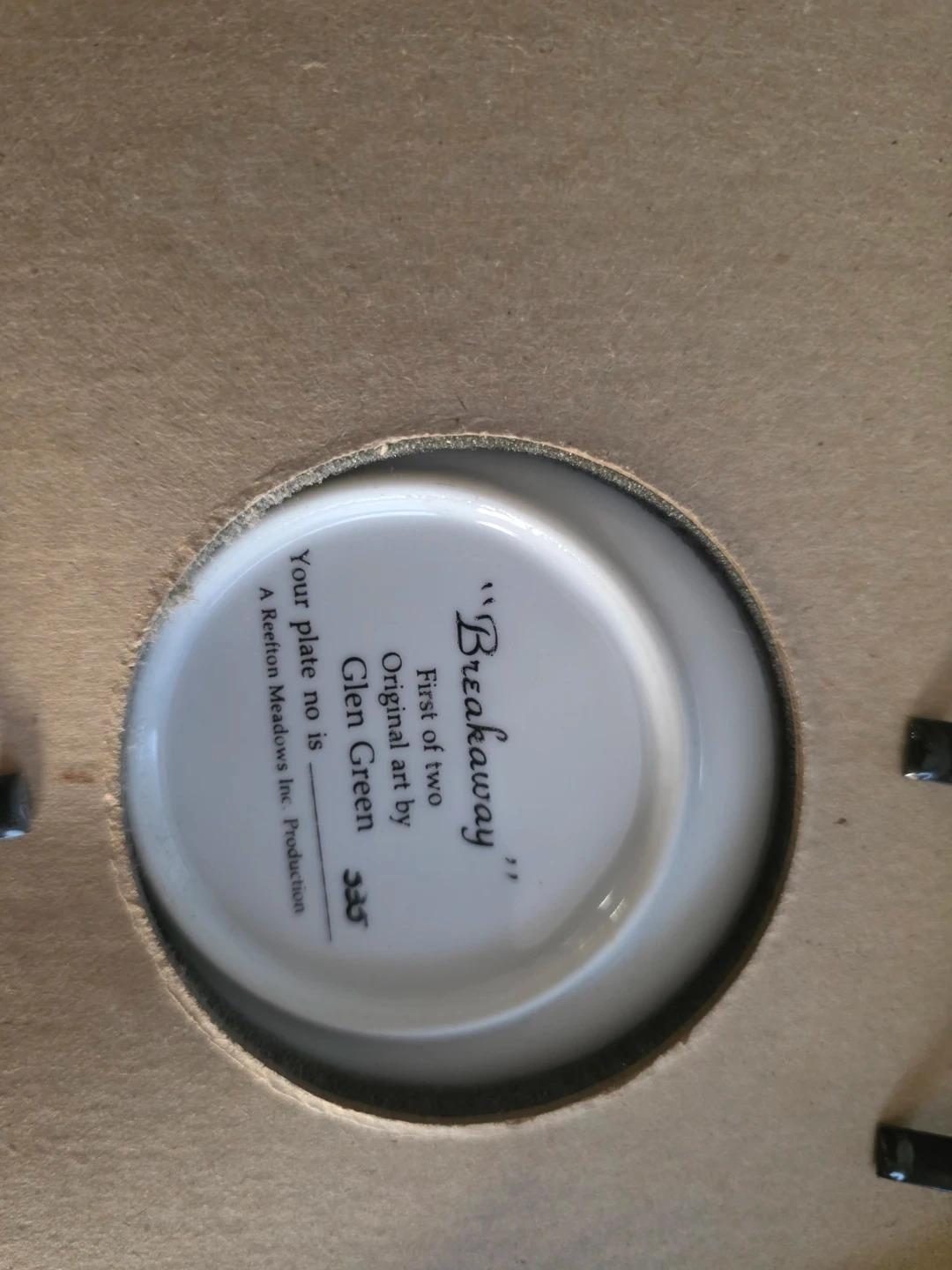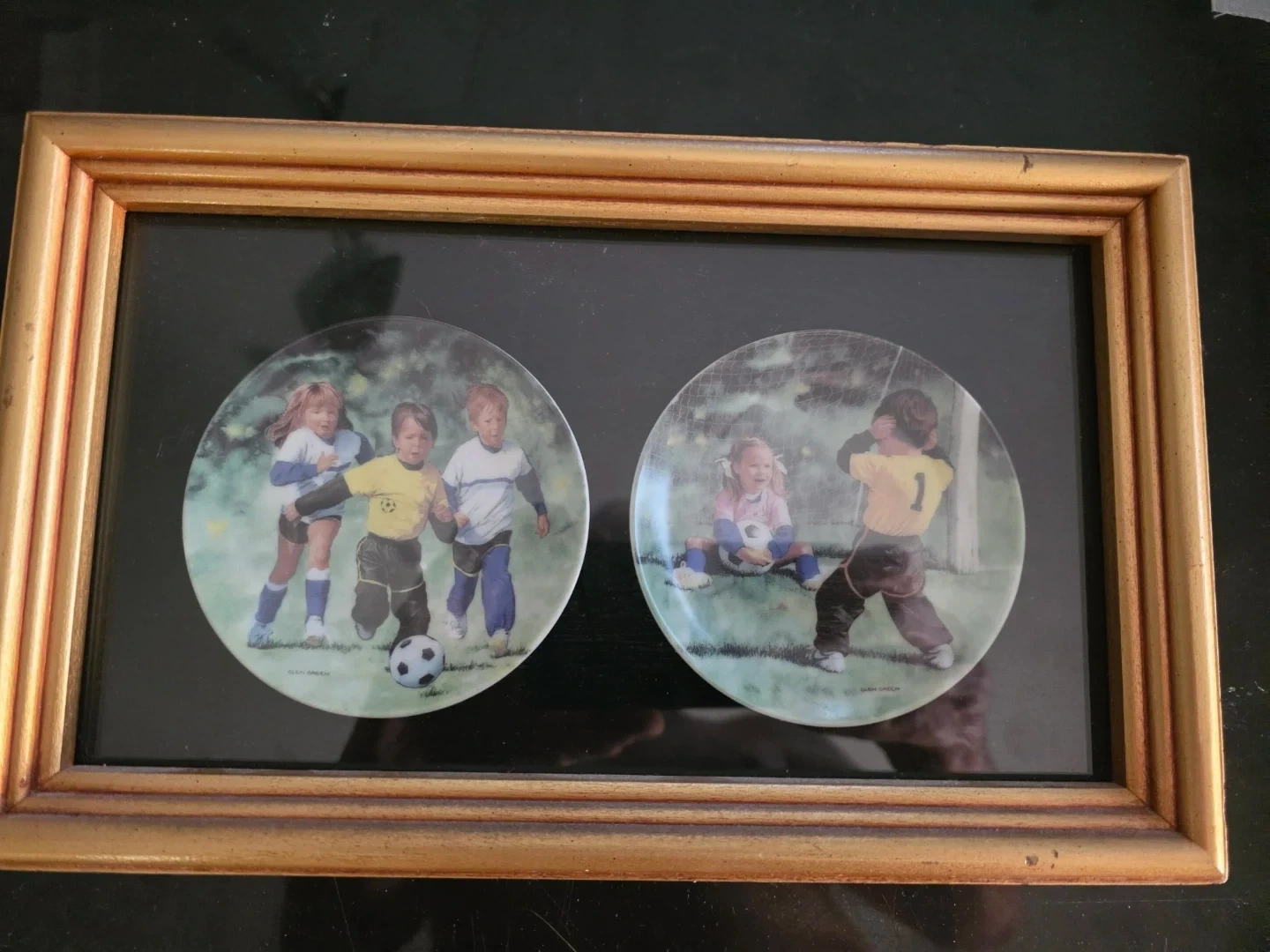 Two decorative plates featuring artwork by Glen Green: 'The Save' and 'Breakaway'. Both plates are from the 'Second of two' and 'First of two' series respectively, produced by Redlon Meadows Inc. Mounted in a wooden frame.