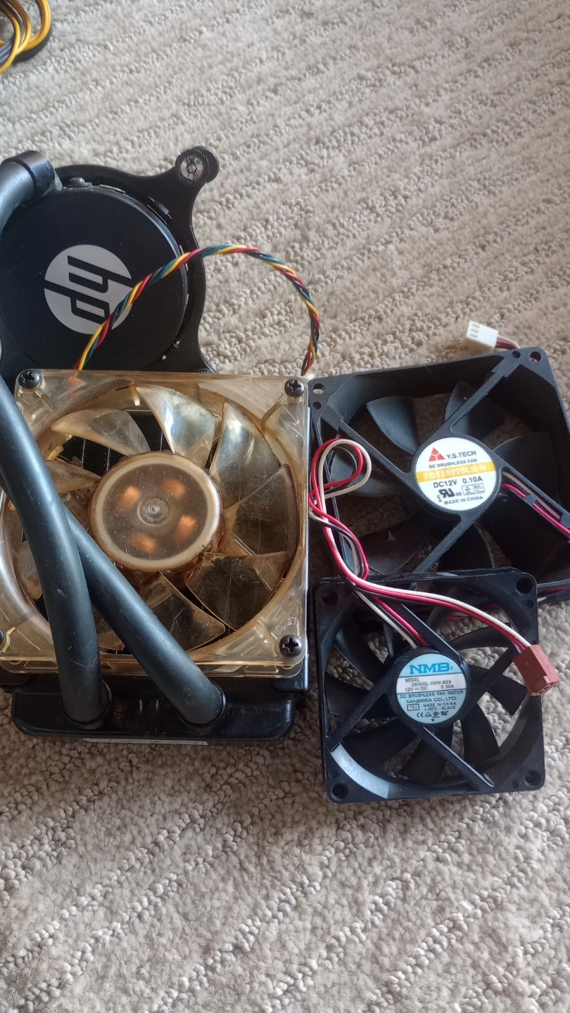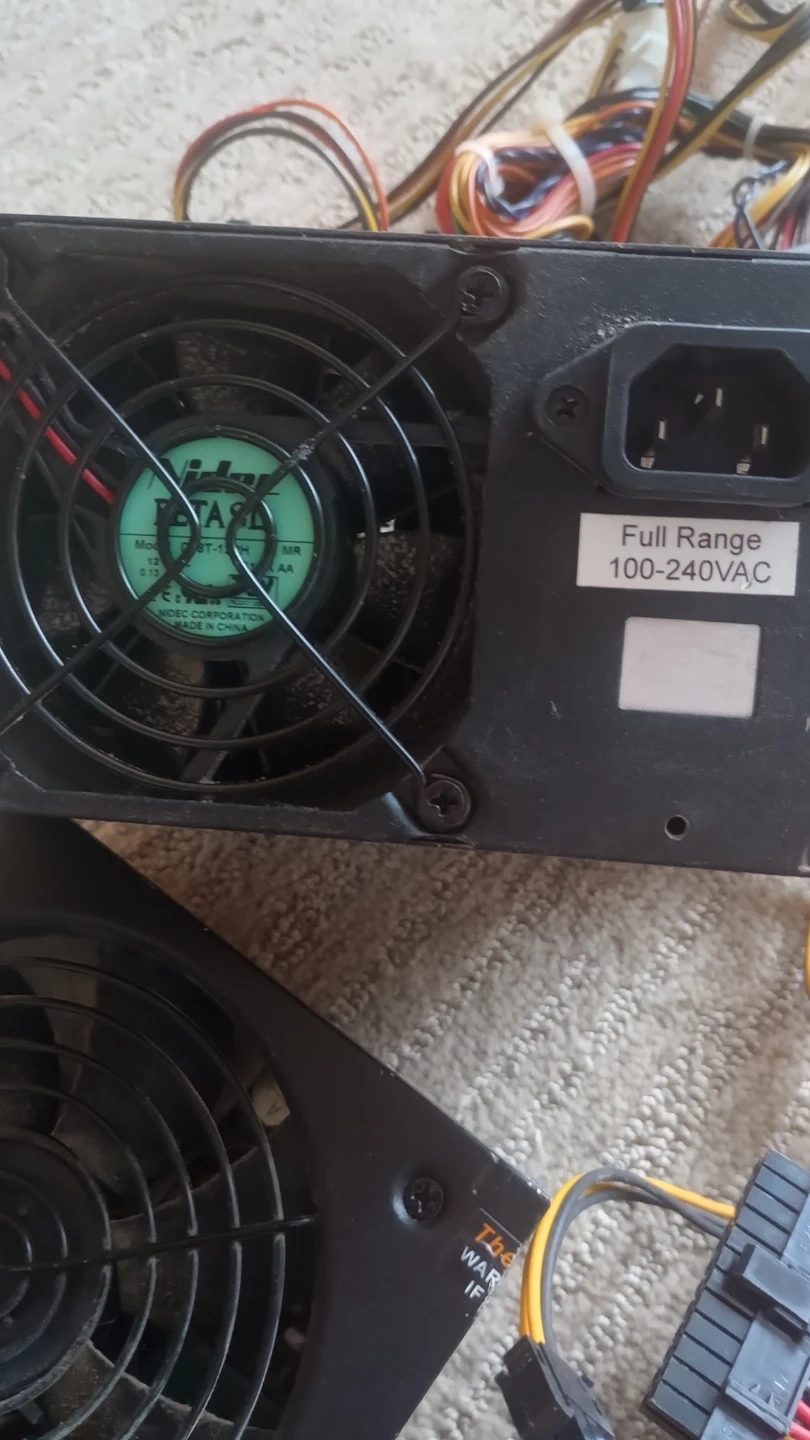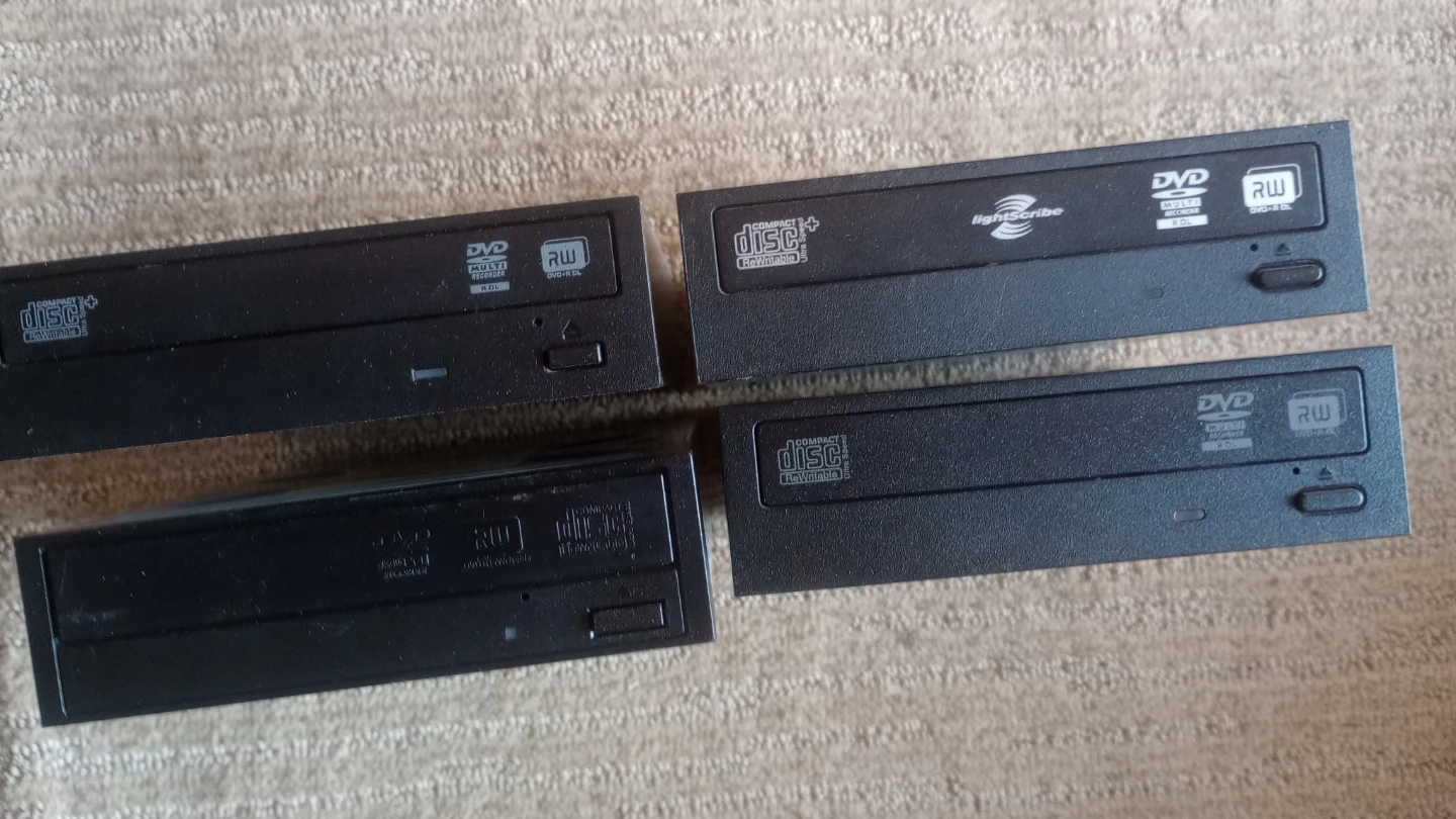 Bundle of computer parts including multiple keyboards, a Thermaltake TR2 500W power supply, and four DVD/CD drives. Various brands and models included for PC building or repairs. Power supply input voltage is 100-240VAC.