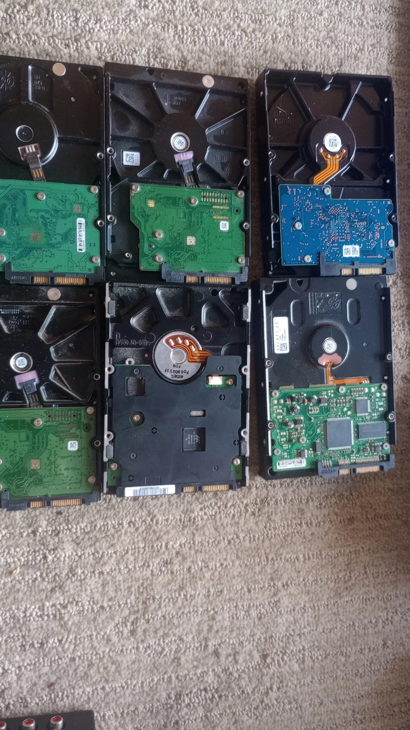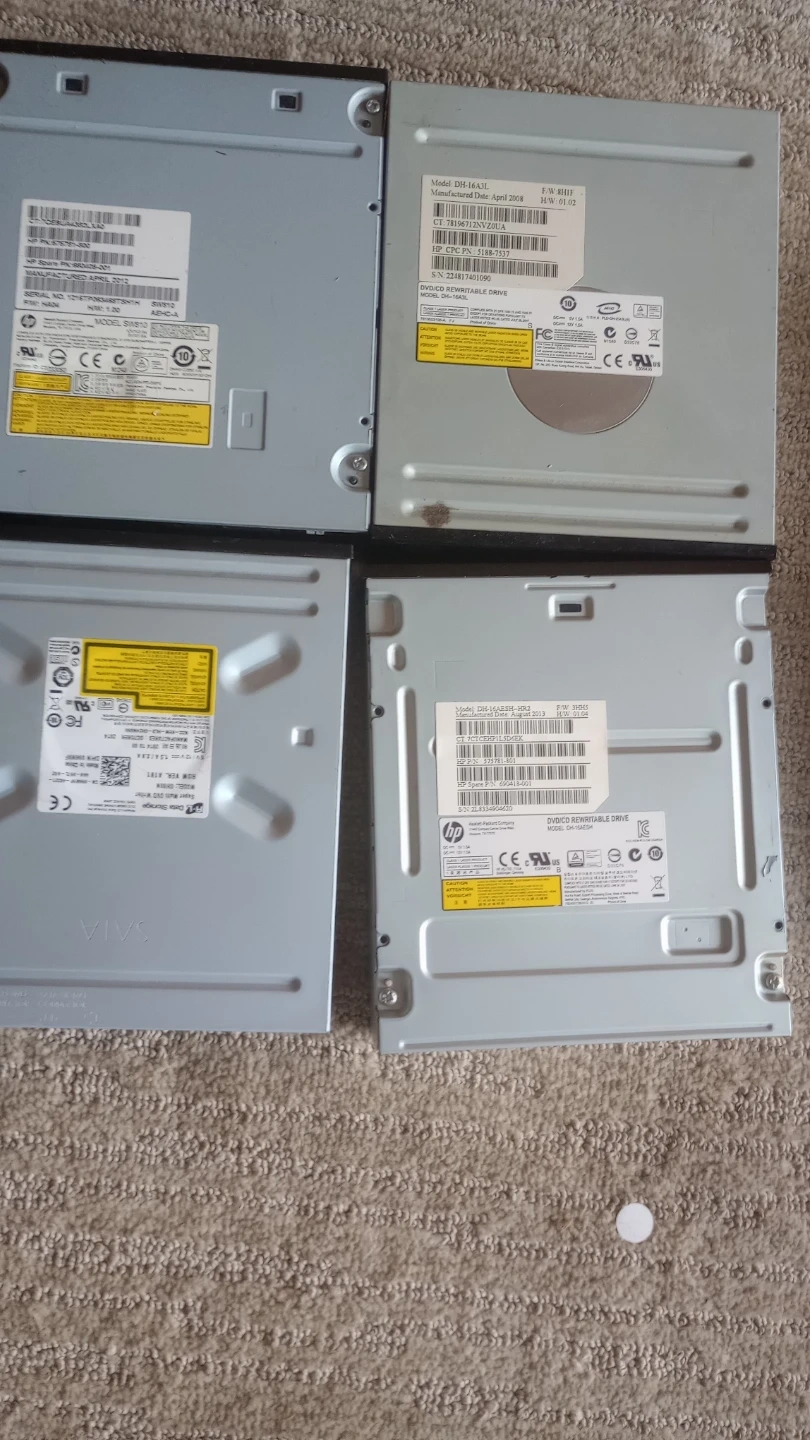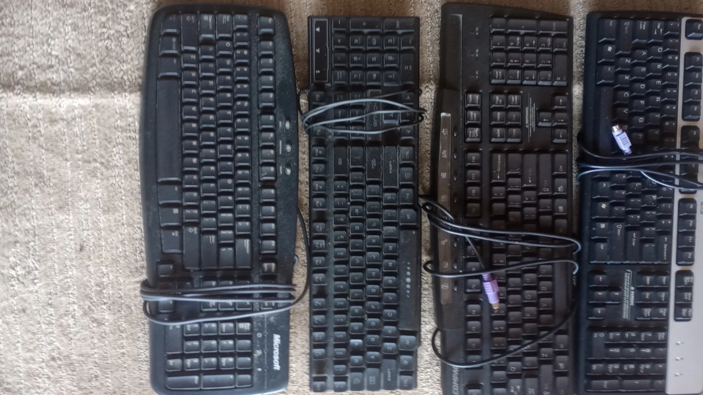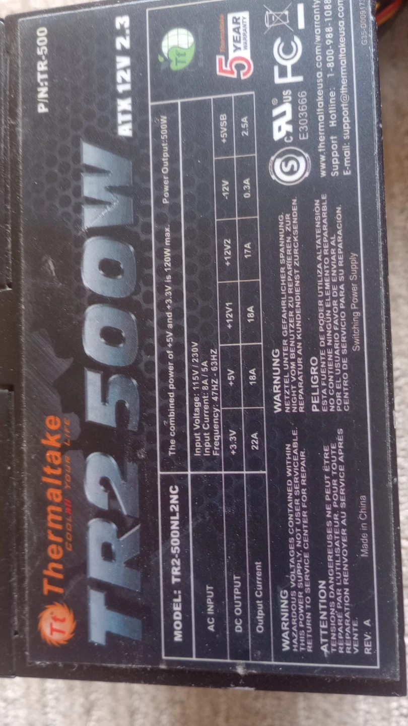 Bundle of computer parts including multiple keyboards, a Thermaltake TR2 500W power supply, and four DVD/CD drives. Various brands and models included for PC building or repairs. Power supply input voltage is 100-240VAC.