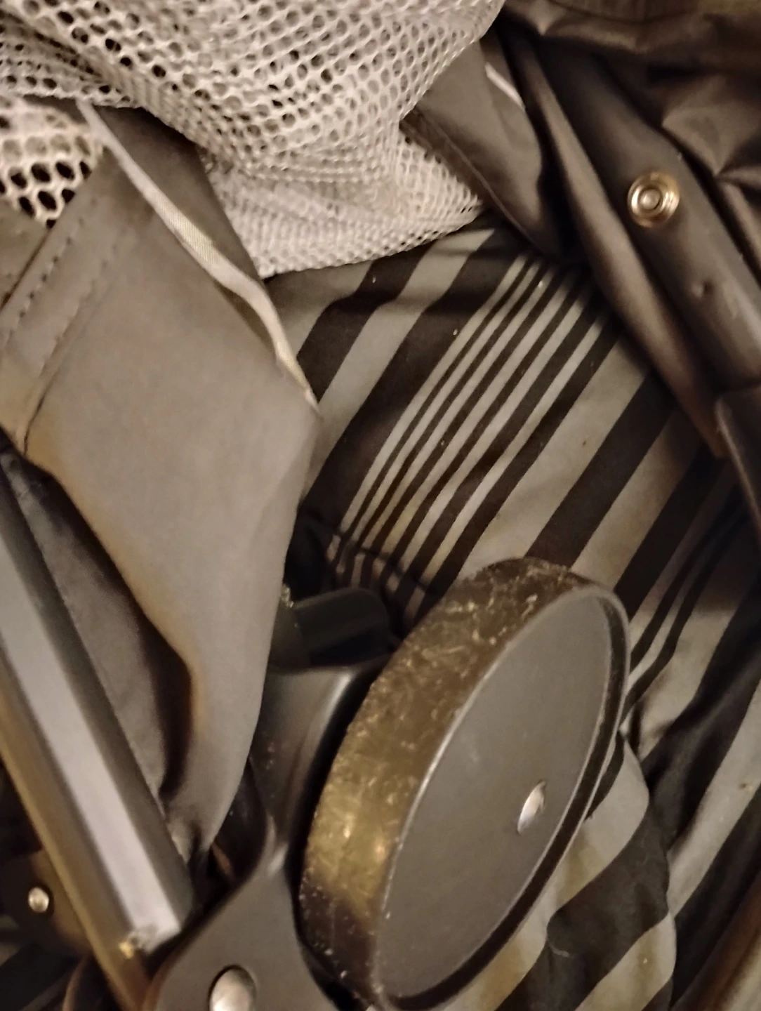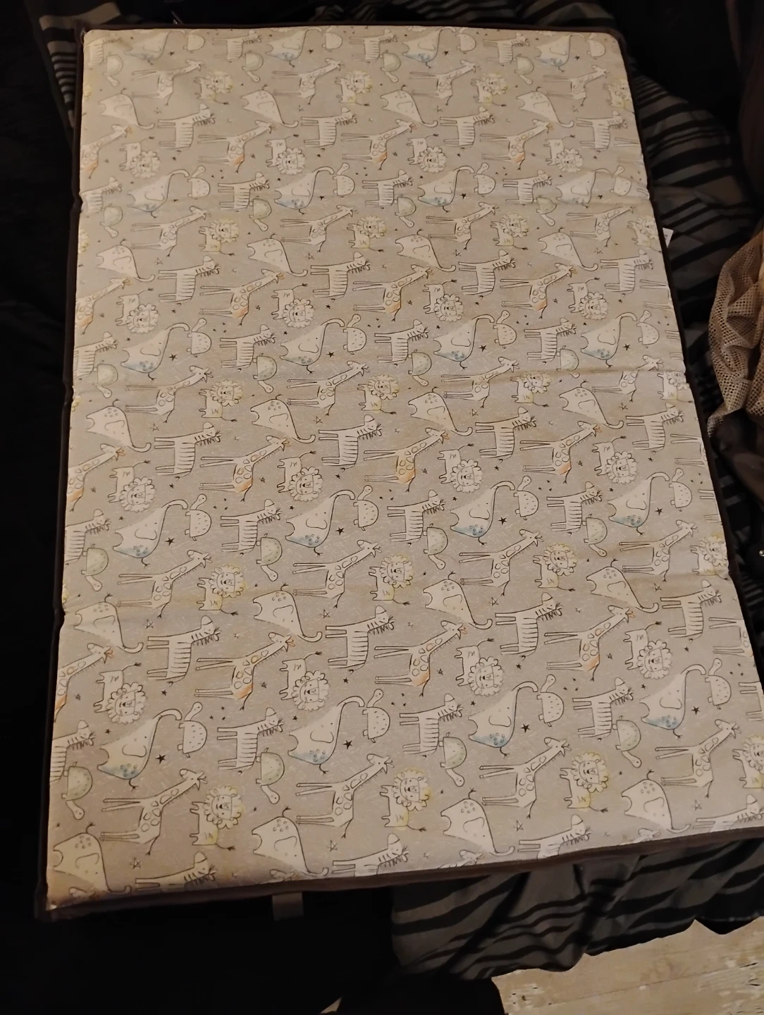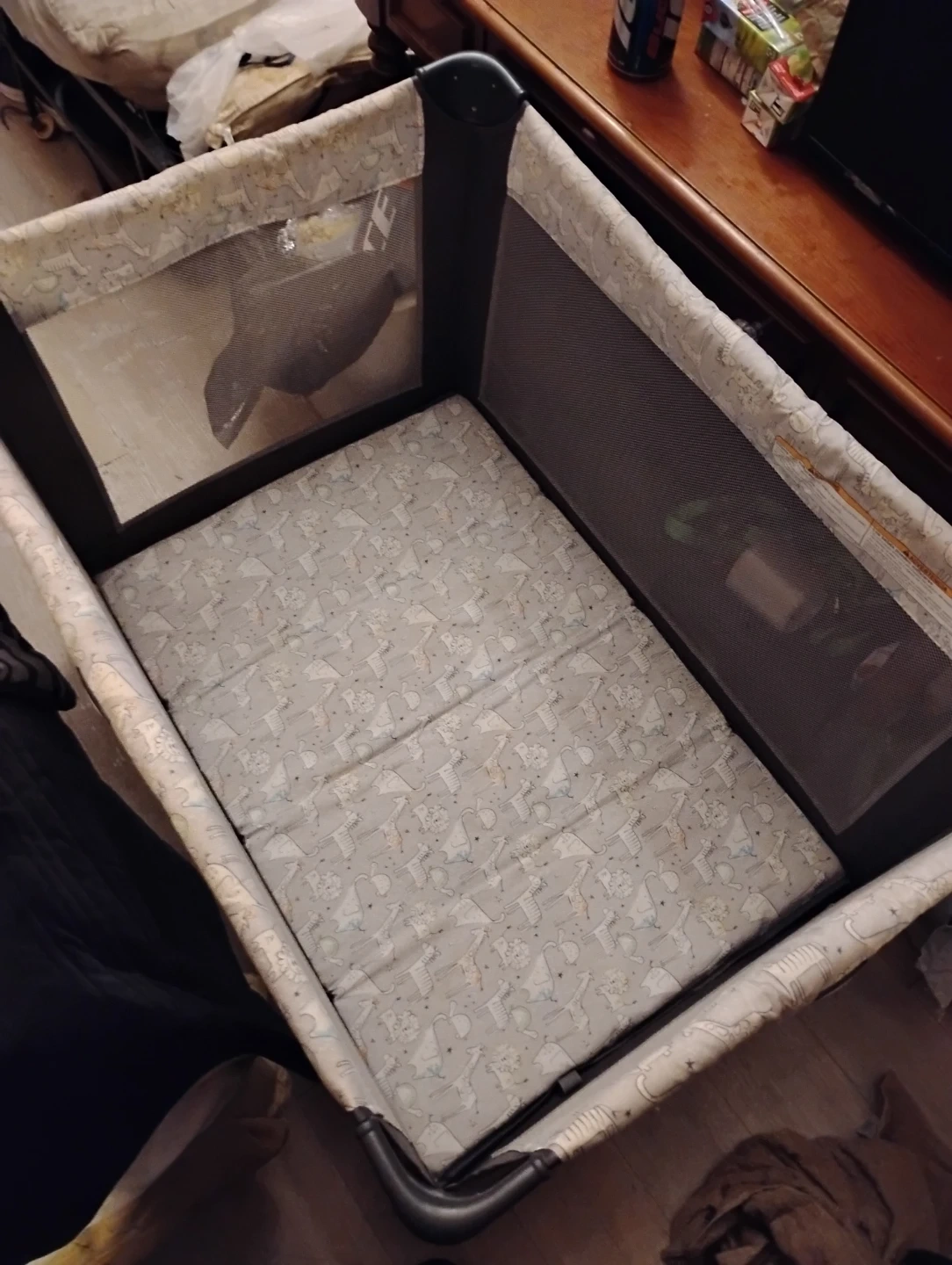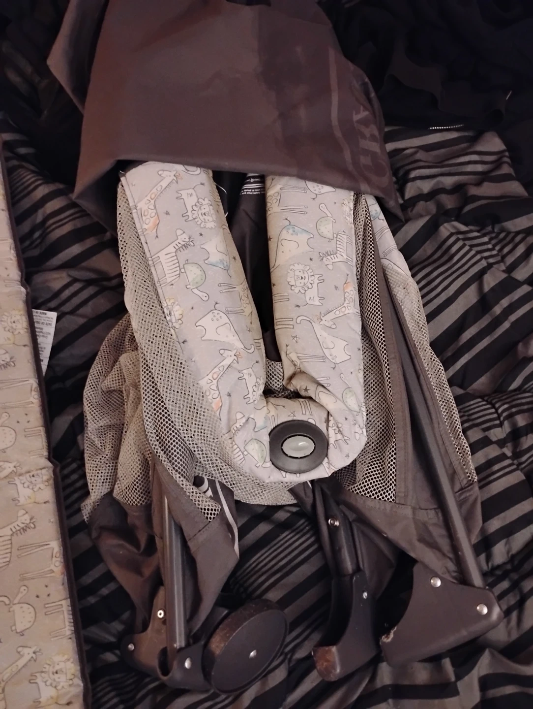 Graco portable playard with a gray frame and patterned fabric. Includes a dark gray carrying bag for storage and transport. It's a convenient setup for travel or at home. This playard is suitable for infants and toddlers. Great condition mild wear on tear on wheels