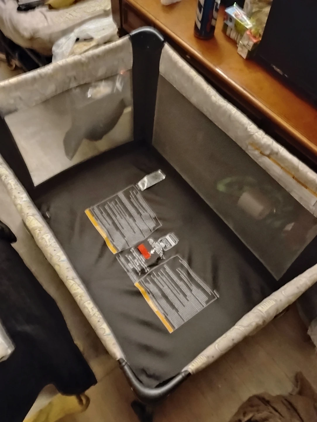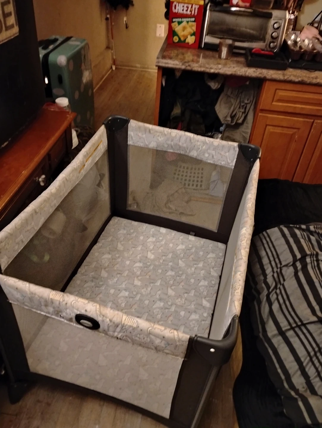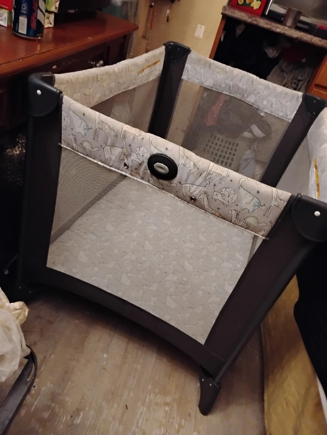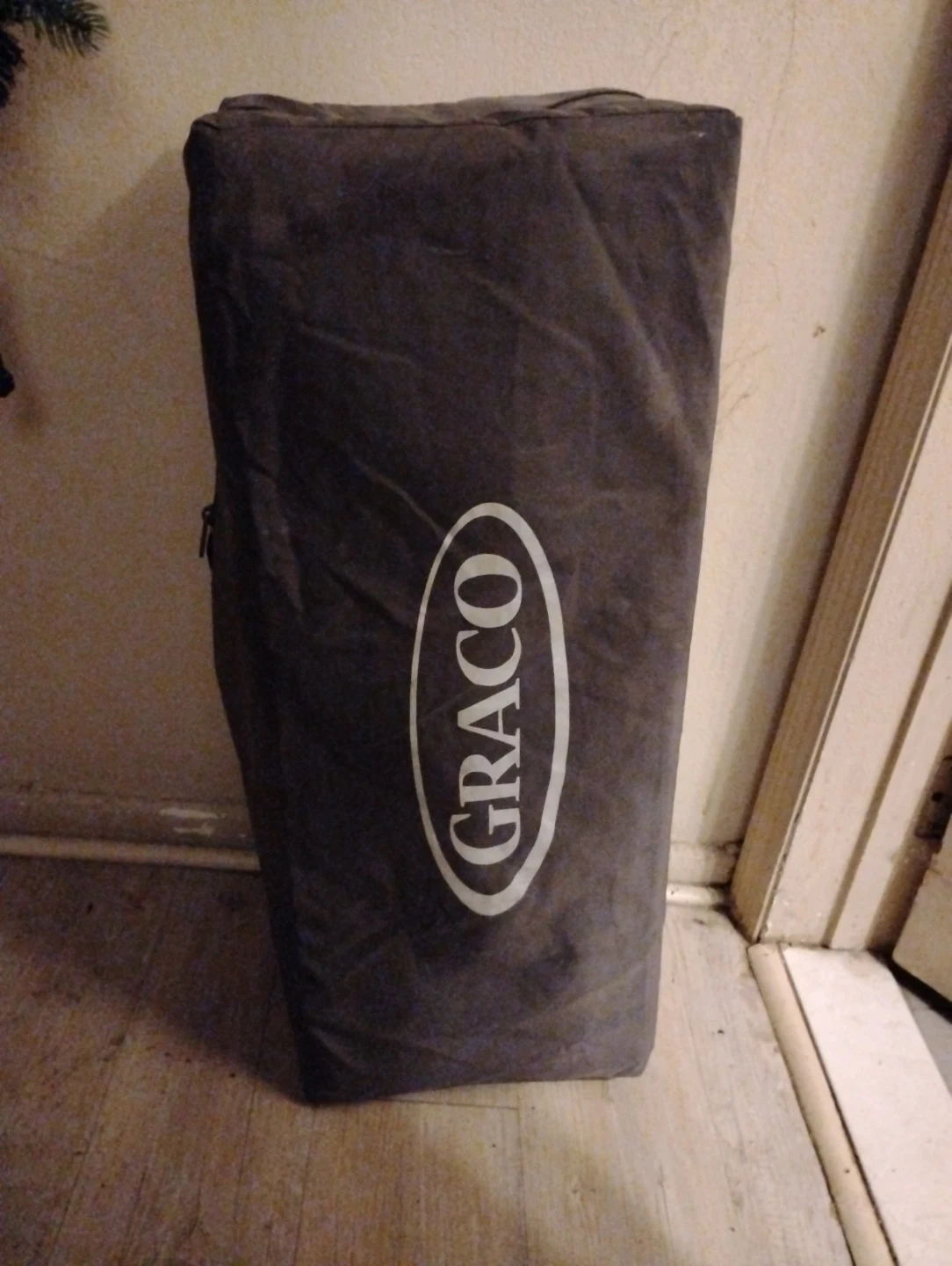 Graco portable playard with a gray frame and patterned fabric. Includes a dark gray carrying bag for storage and transport. It's a convenient setup for travel or at home. This playard is suitable for infants and toddlers. Great condition mild wear on tear on wheels