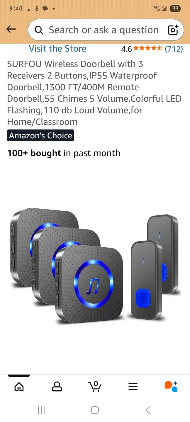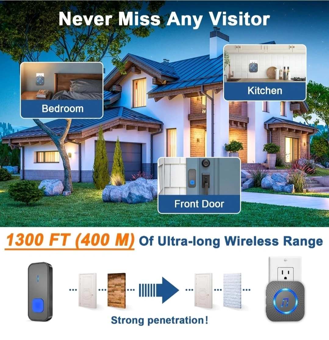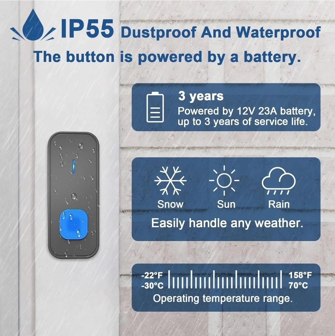 This SURFOU wireless doorbell has a 1300 ft (400 M) ultra-long wireless range. It's IP55 dustproof and waterproof, easily handling snow, sun, and rain. The button is powered by a 12V 23A battery with up to 3 years of service life. The operating temperature range is -22°F to 158°F (-30°C to 70°C).