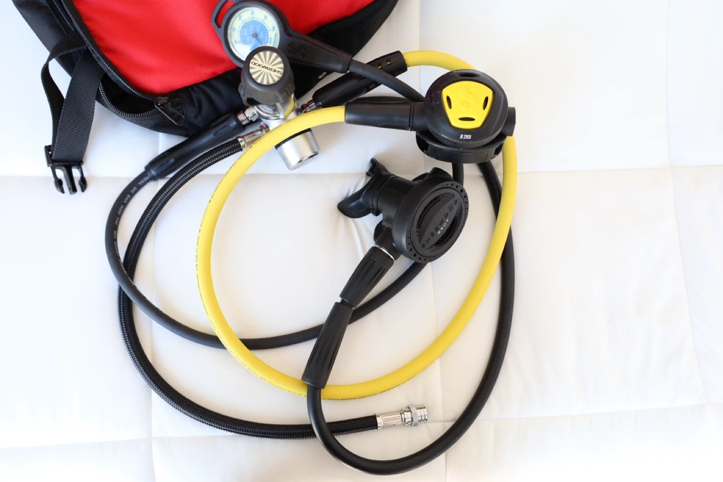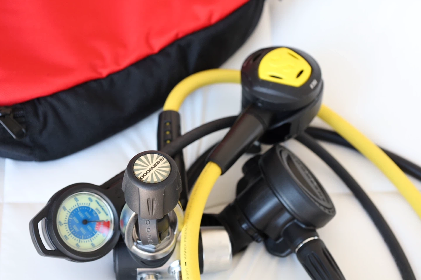 This Sherwood scuba regulator set includes a primary second stage, octopus second stage (Scubapro), and a submersible pressure gauge (Scubapro). It's black and yellow with a red carrying bag. Components are made of durable materials for underwater use. Used once.
