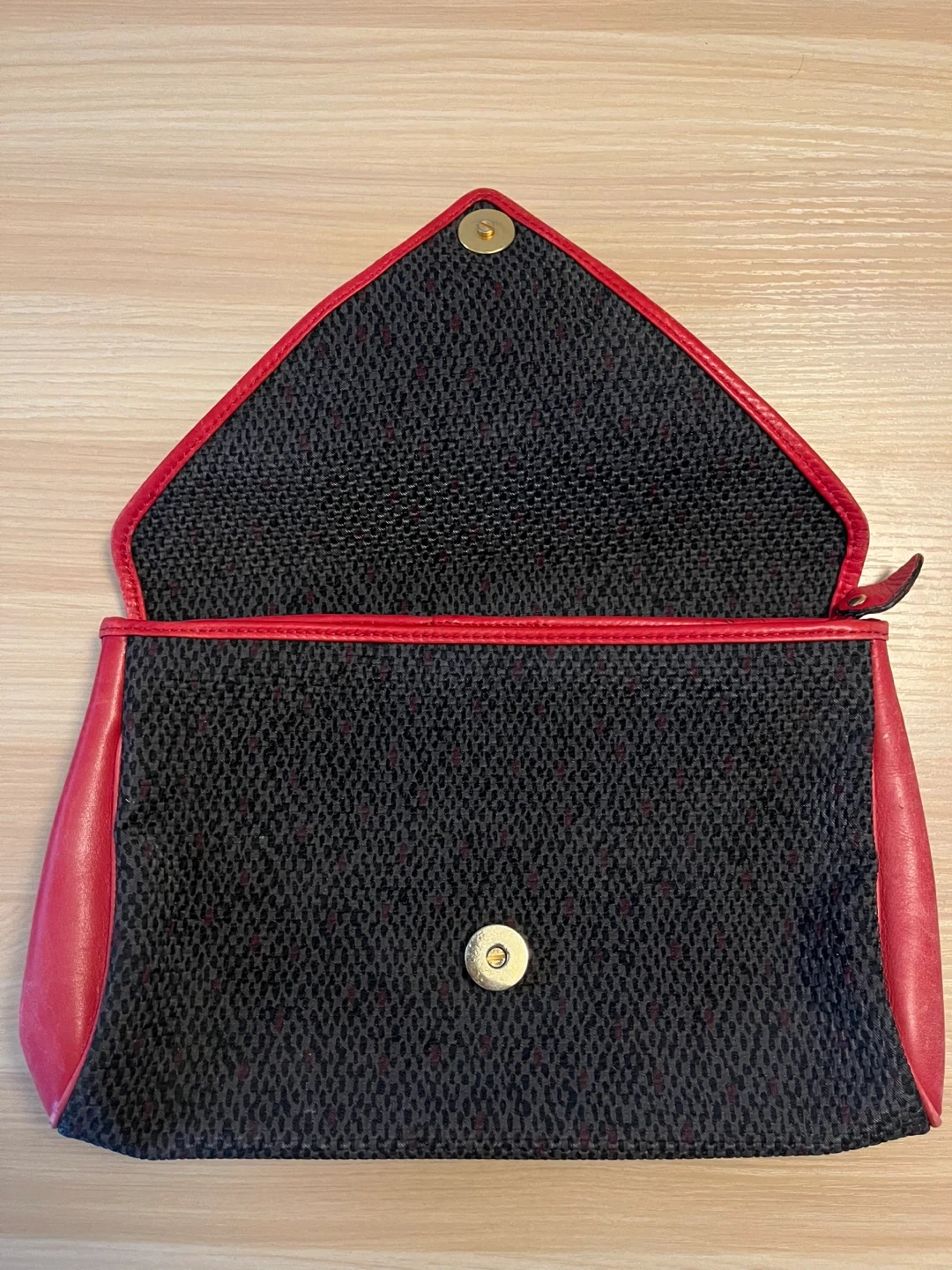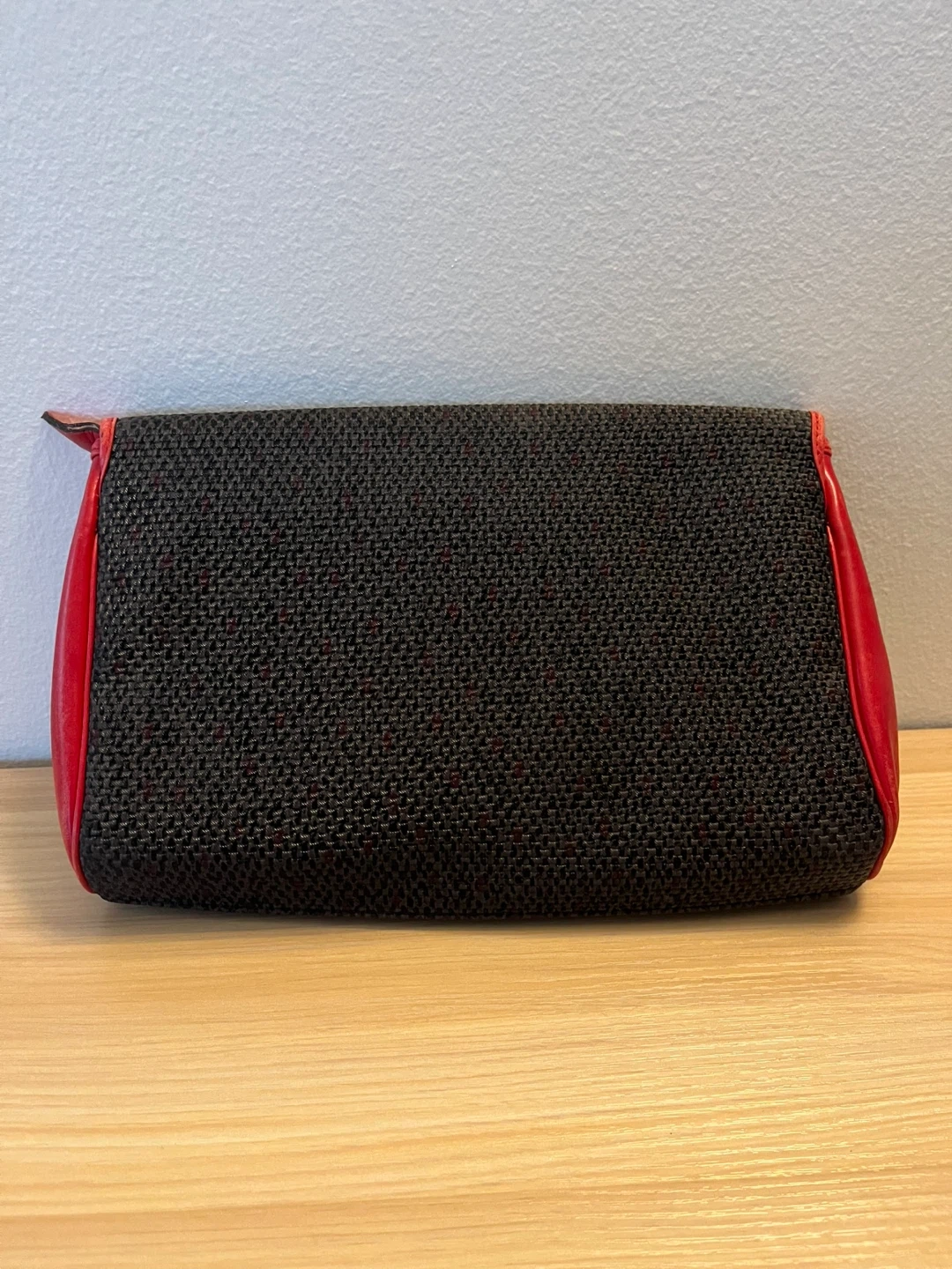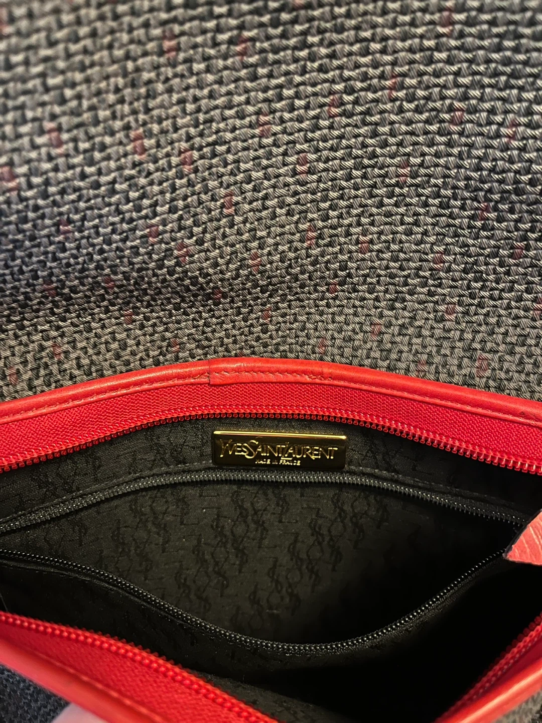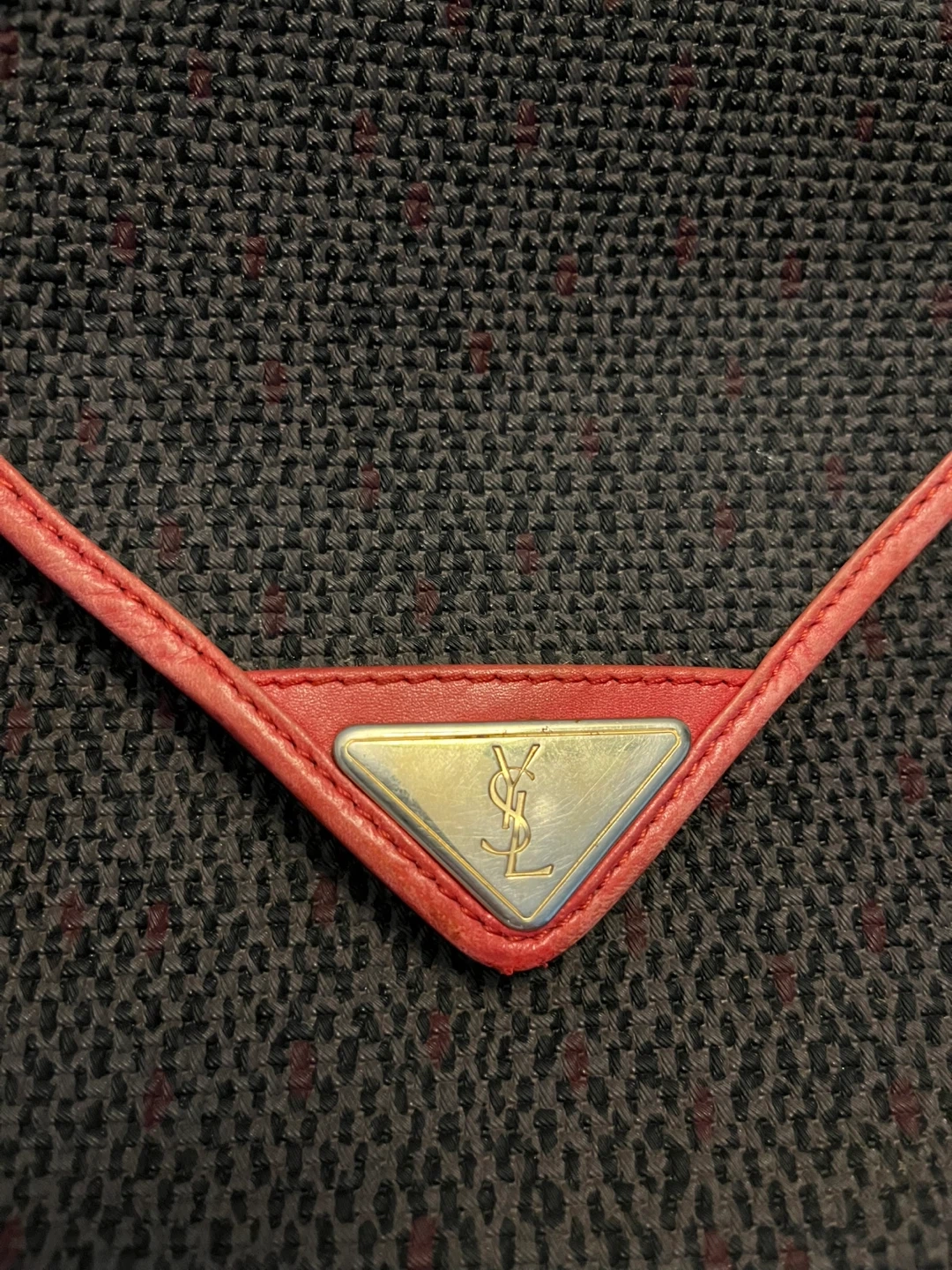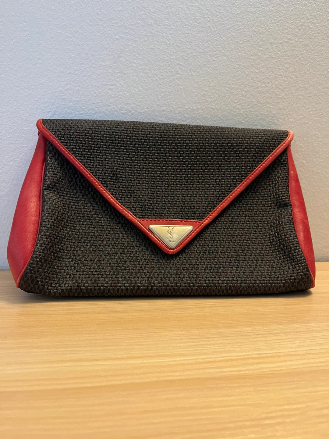 Vintage YSL envelope clutch. Features red leather accents and a textured grey fabric body. Some wear on leather and hardware but otherwise in good condition