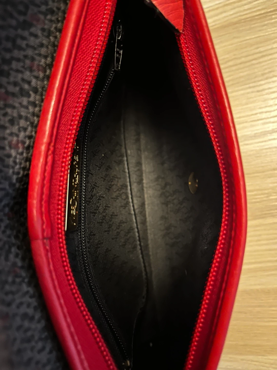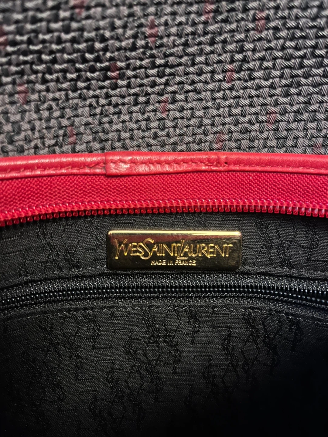 Vintage YSL envelope clutch. Features red leather accents and a textured grey fabric body. Some wear on leather and hardware but otherwise in good condition