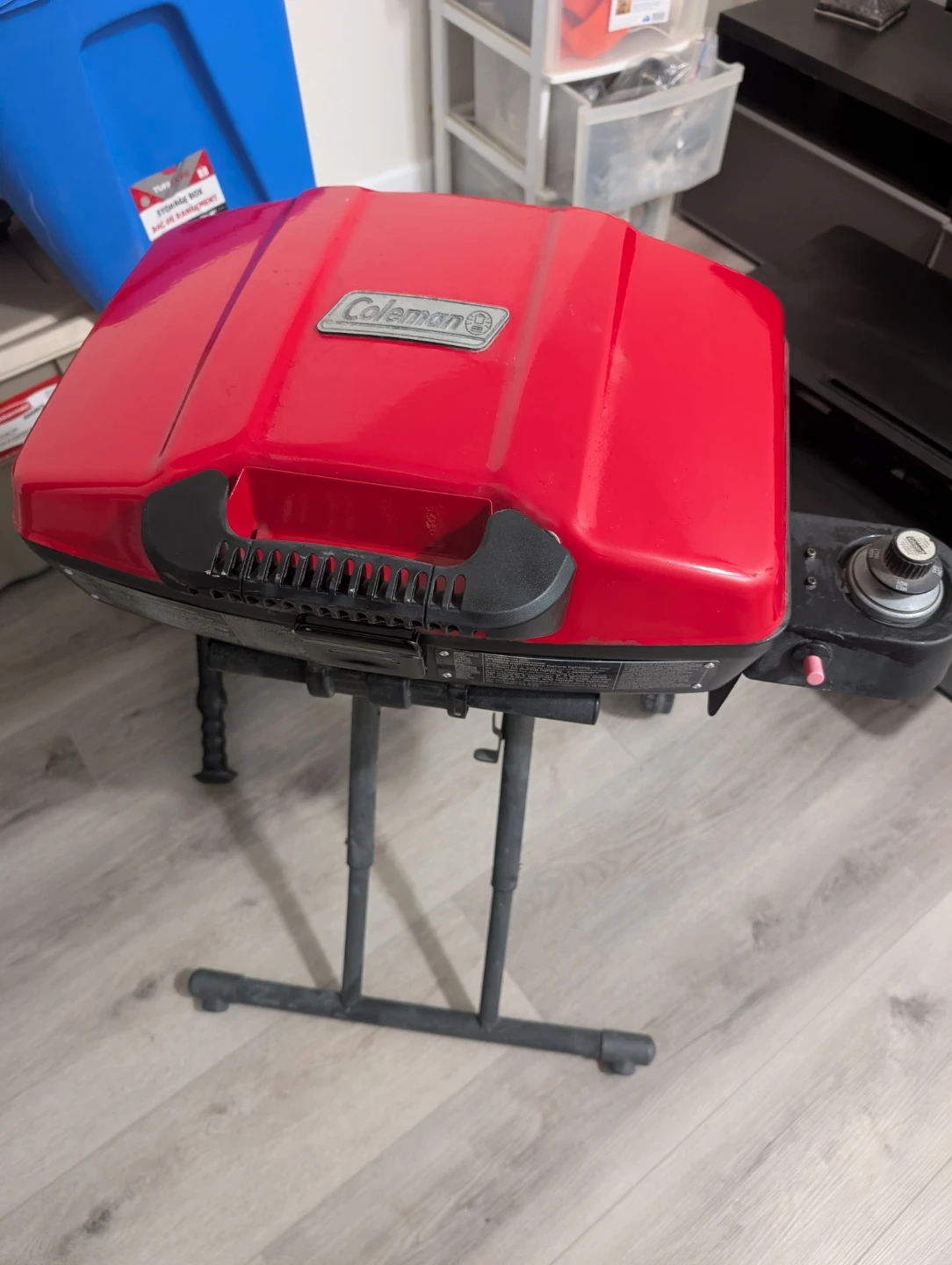 This is a red Coleman portable propane grill. It's a great size for camping or small gatherings. Perfect for whipping up a quick meal outdoors!