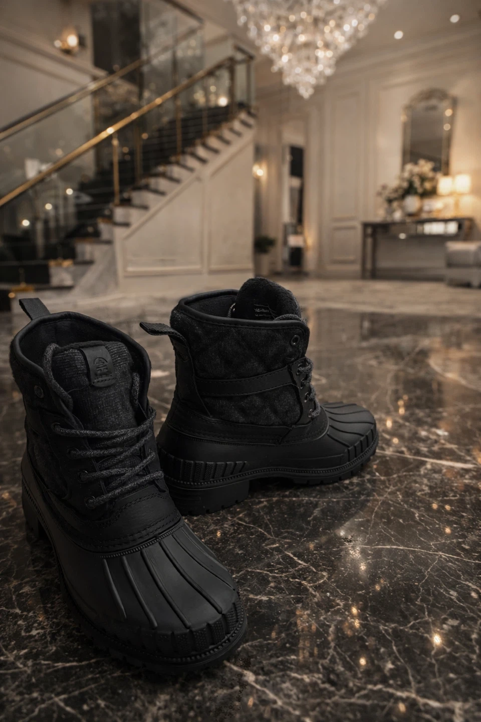 Number:7, Black duck boots. Water-resistant rubber shell and lug sole. Quilted textile shaft with lace-up closure. Ideal for cold weather. Brand new.