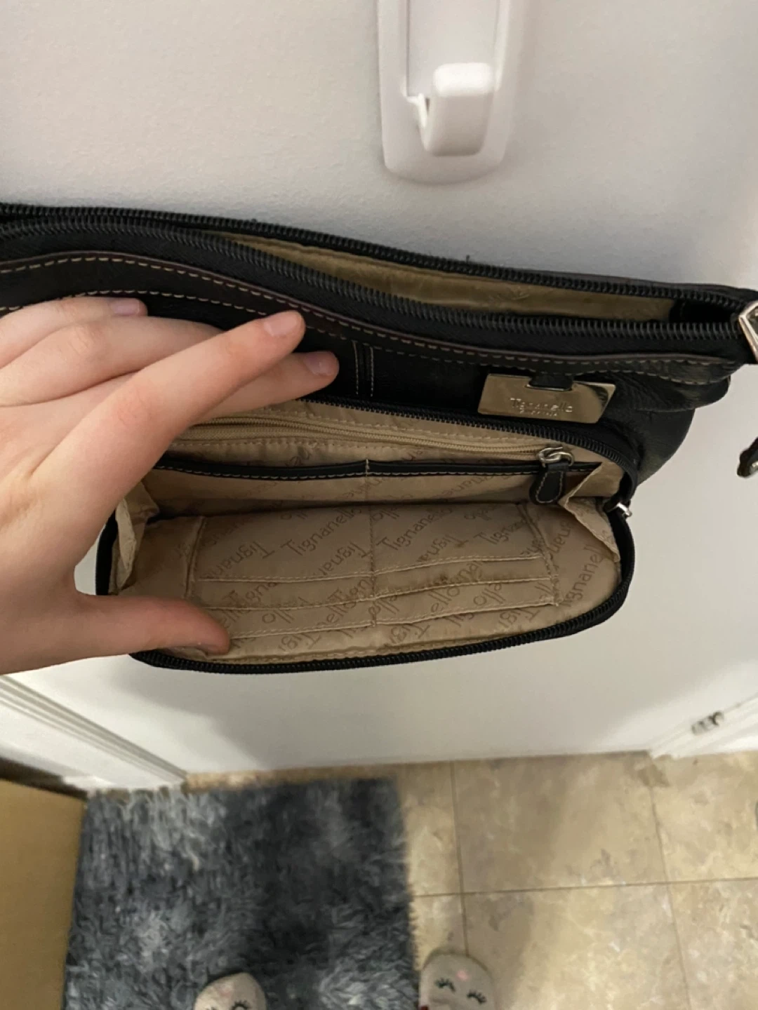 Black cross body purse that has cracks along the top of the handle (would look good if covered in fabric or if you knit a tube around it). Has two main pockets with other pockets and card holders inside. Clean inside