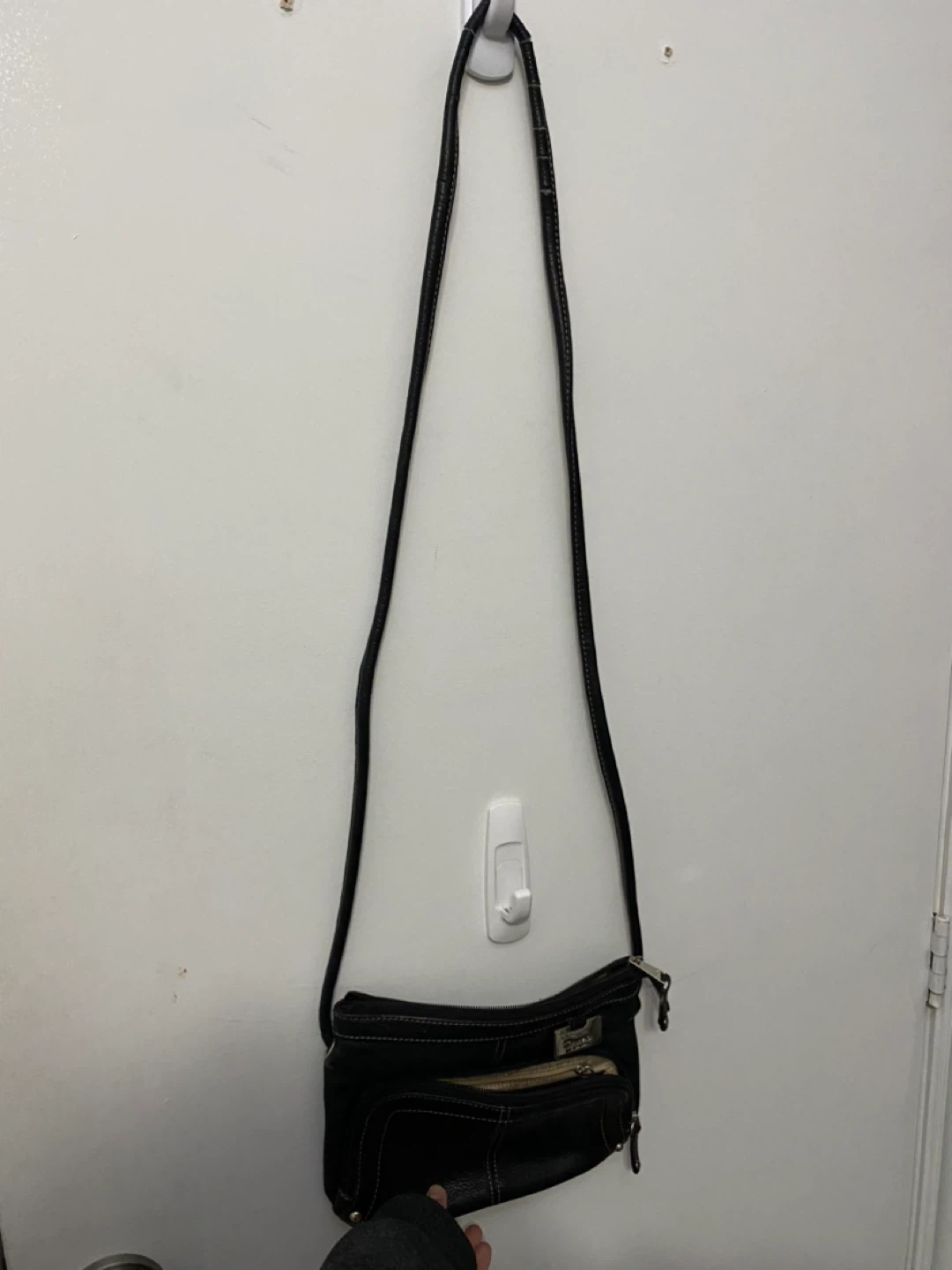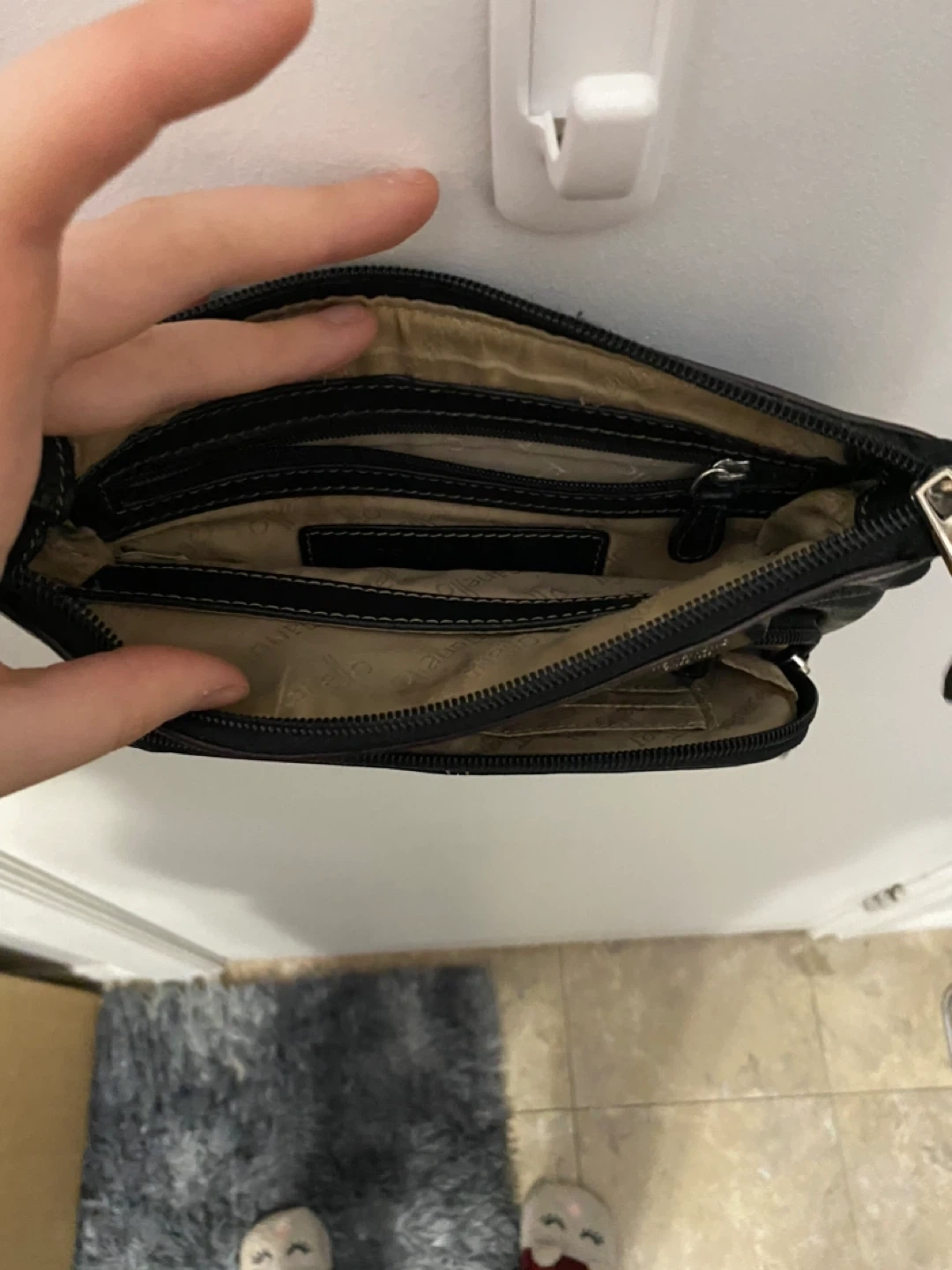 Black cross body purse that has cracks along the top of the handle (would look good if covered in fabric or if you knit a tube around it). Has two main pockets with other pockets and card holders inside. Clean inside