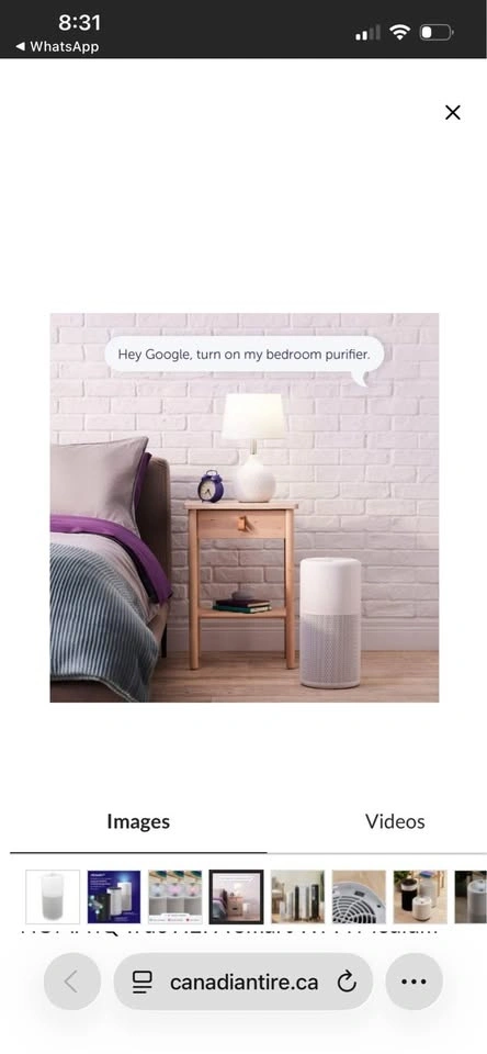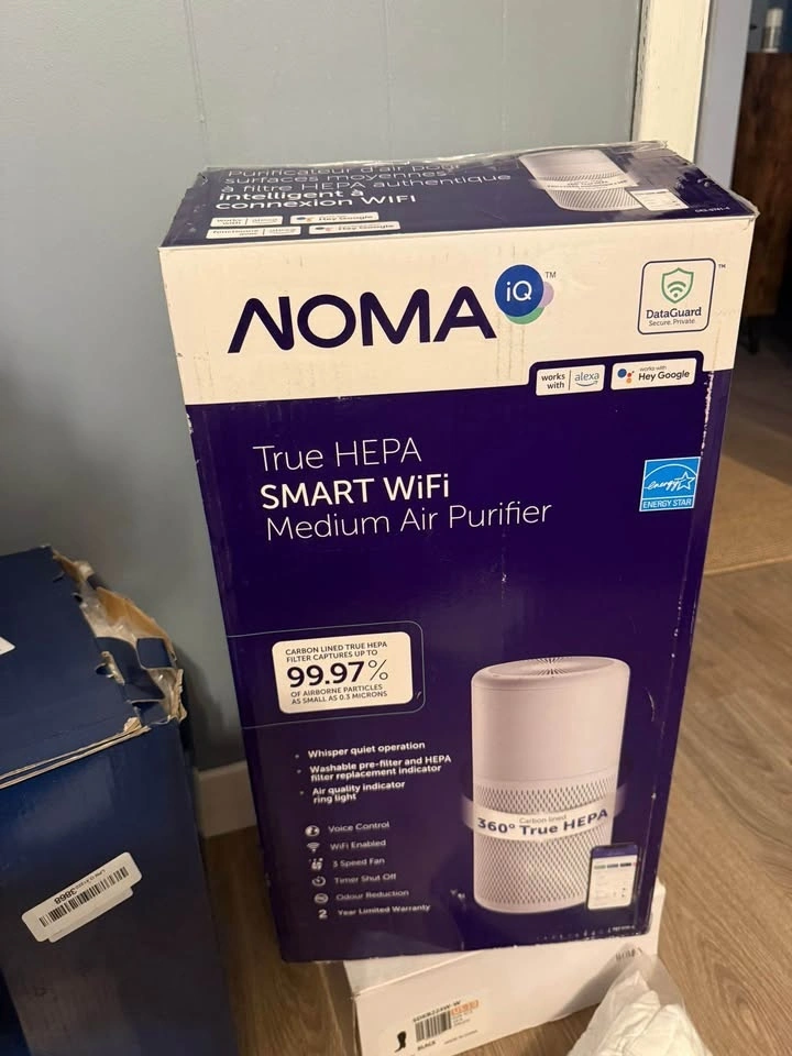 This NOMA iQ air purifier features True HEPA filtration and Smart Wi-Fi connectivity, suitable for medium-sized rooms. It effectively removes airborne particles for cleaner indoor air.