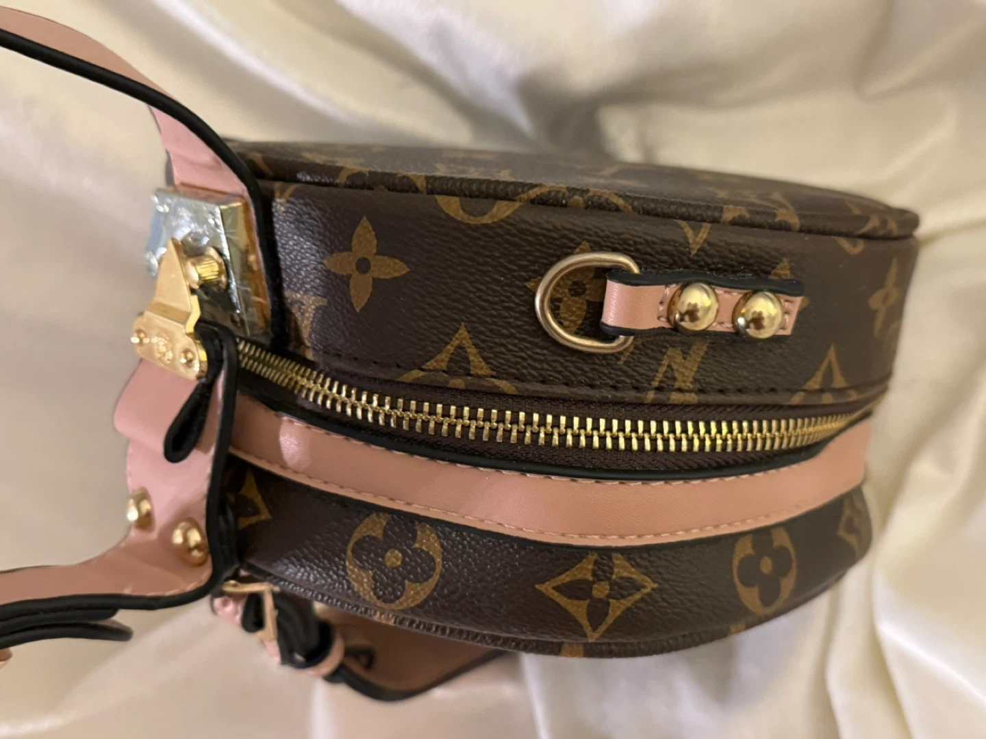 This is a Louis Vuitton round bag with the signature monogram print. It features a zippered compartment and adjustable strap. Bag material is canvas with leather trim.