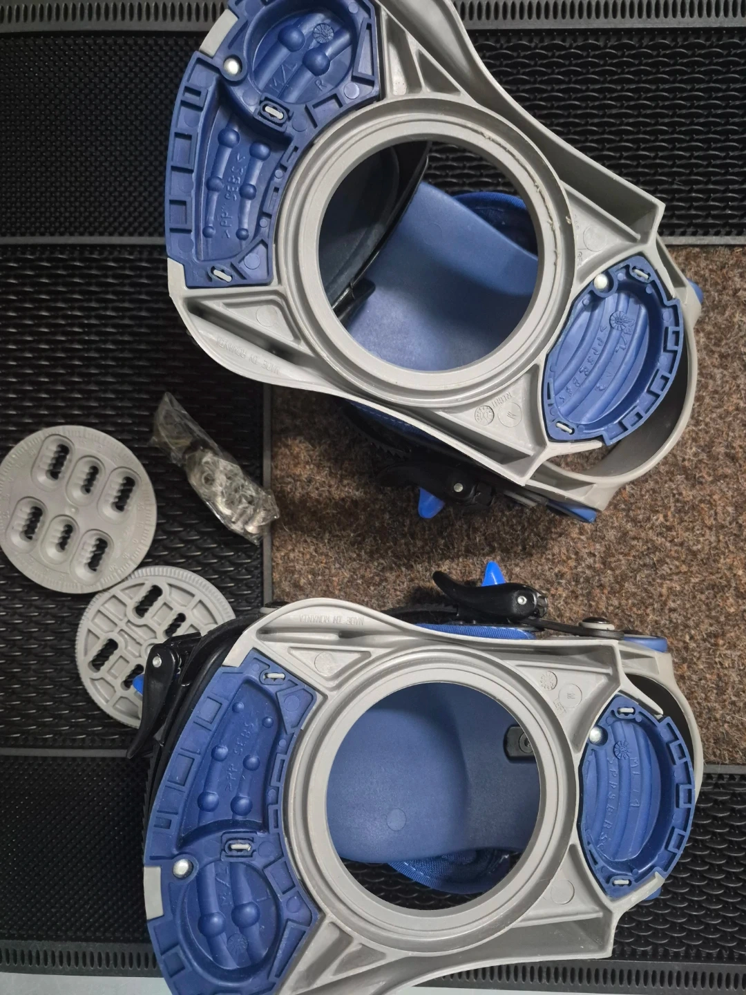 Pair of Salomon snowboard bindings in blue and grey. Includes mounting discs and hardware. Bindings are adjustable for a secure fit.