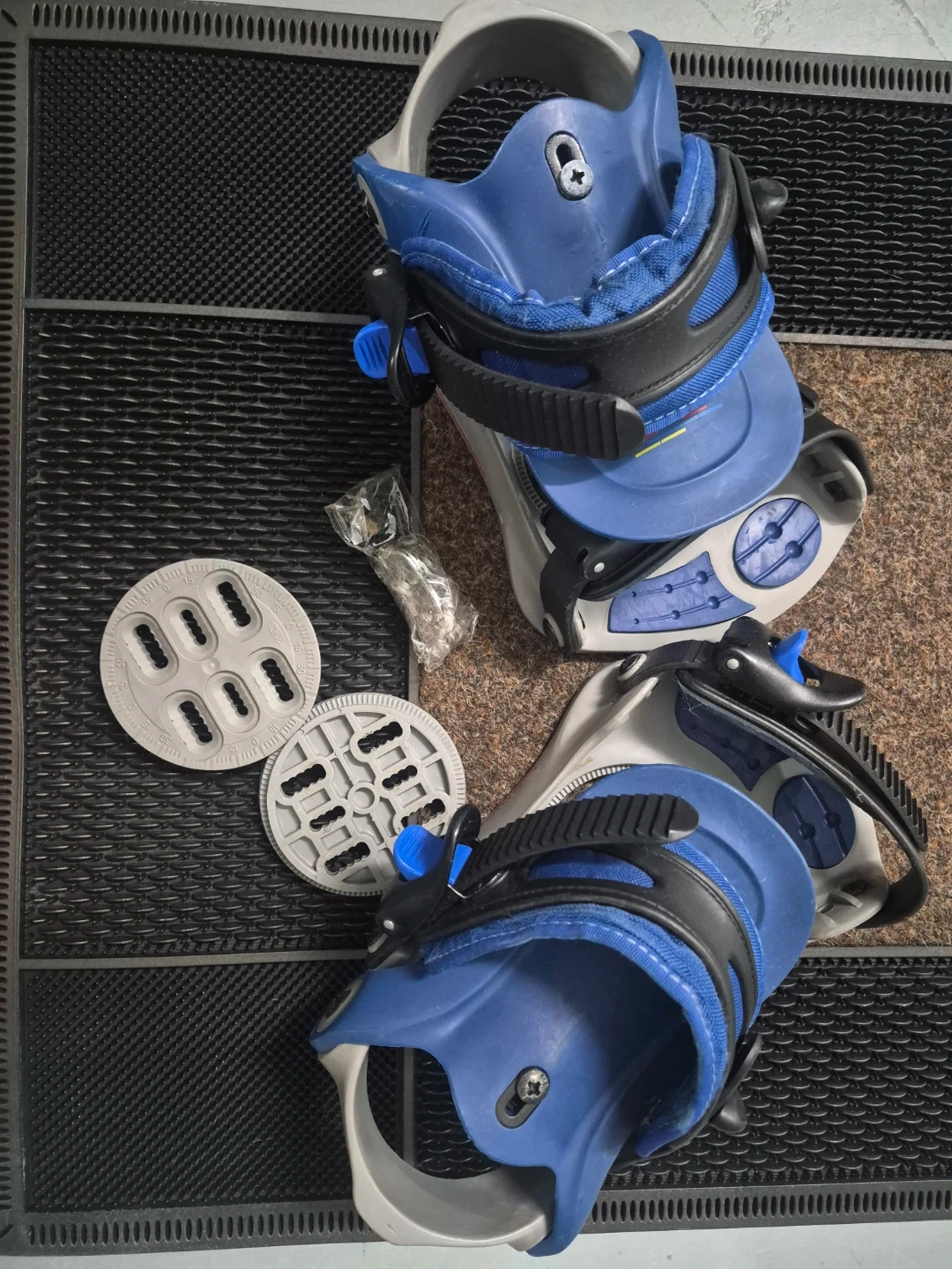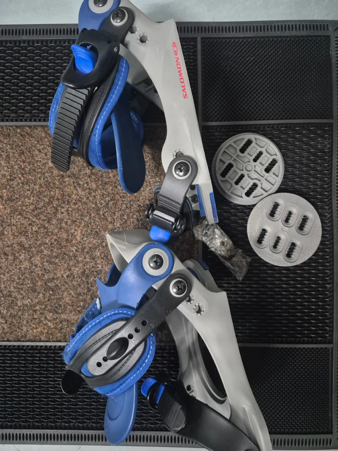 Pair of Salomon snowboard bindings in blue and grey. Includes mounting discs and hardware. Bindings are adjustable for a secure fit.