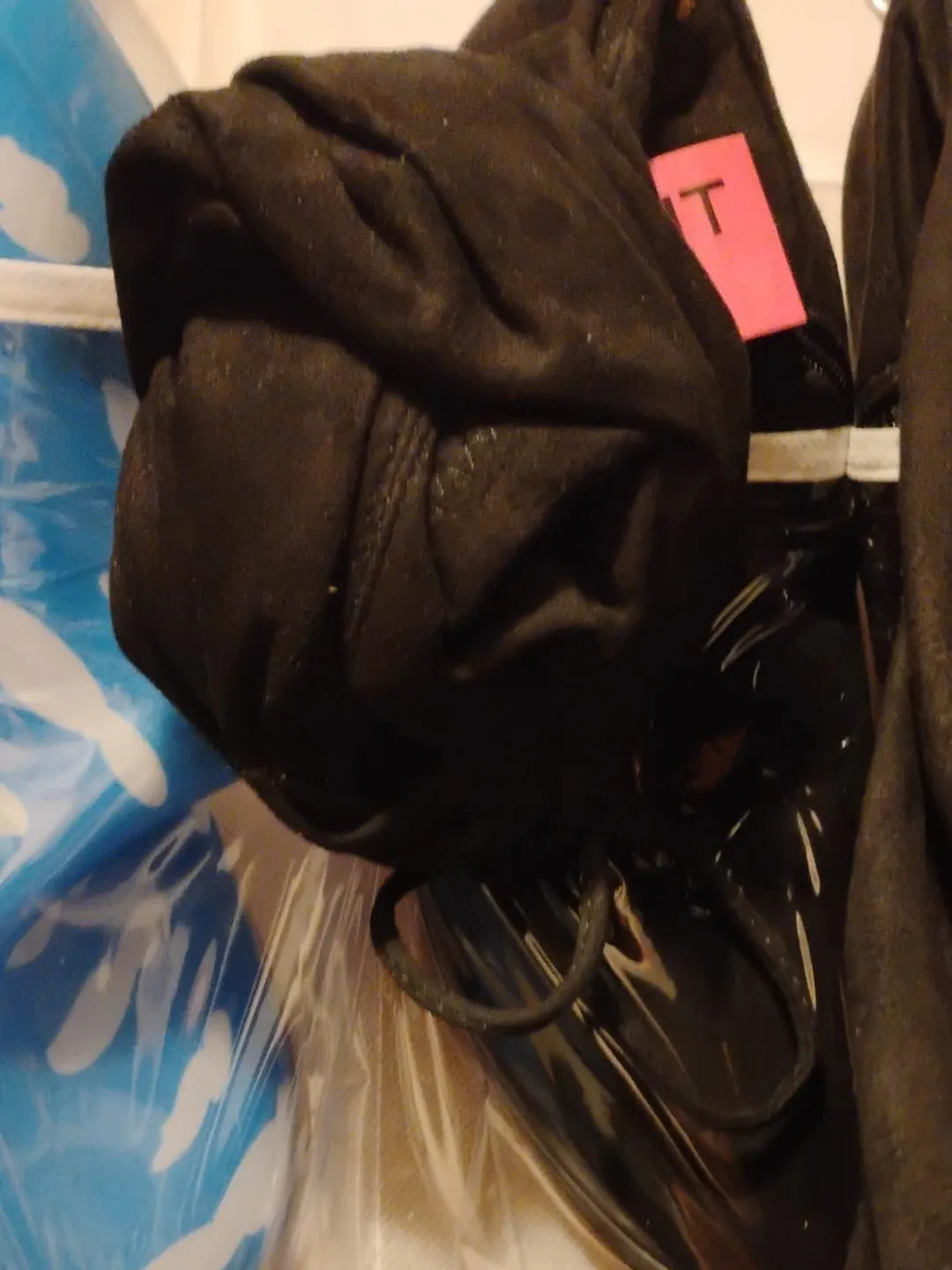 Black patent leather shoes. Features laces and a pink tag with a "T" on it. Some creasing visible on the patent material.