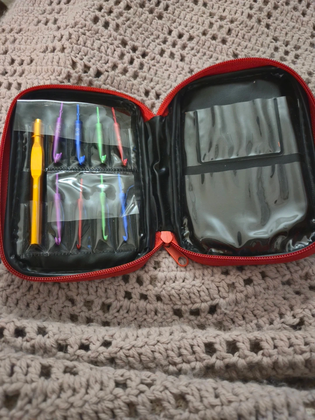 This set includes a variety of crochet hooks in different colors. It comes in a red zippered case for easy storage and portability. Perfect for crafters on the go!