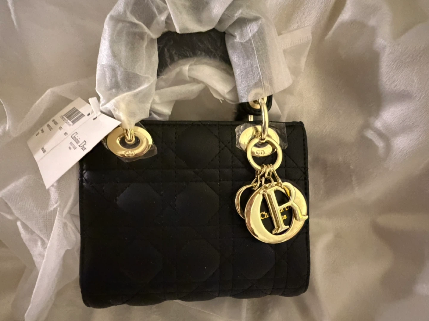 Black quilted lambskin leather handbag. Gold-tone hardware and 'D.i.o.r.' charm. Comes with authenticity tag.