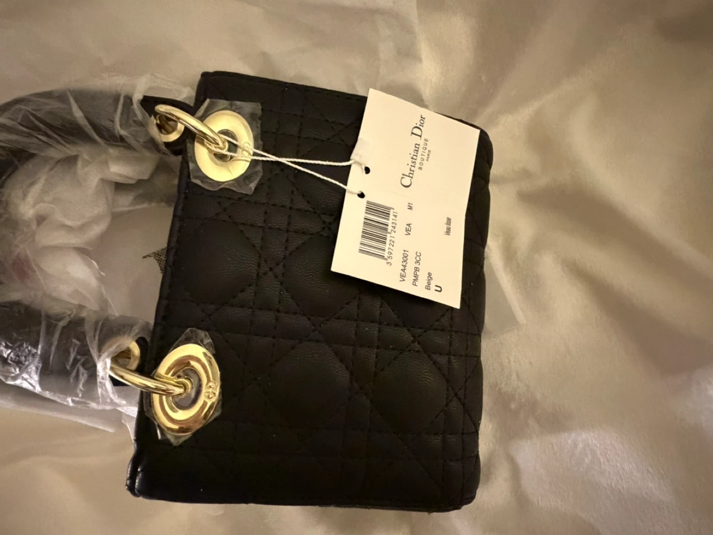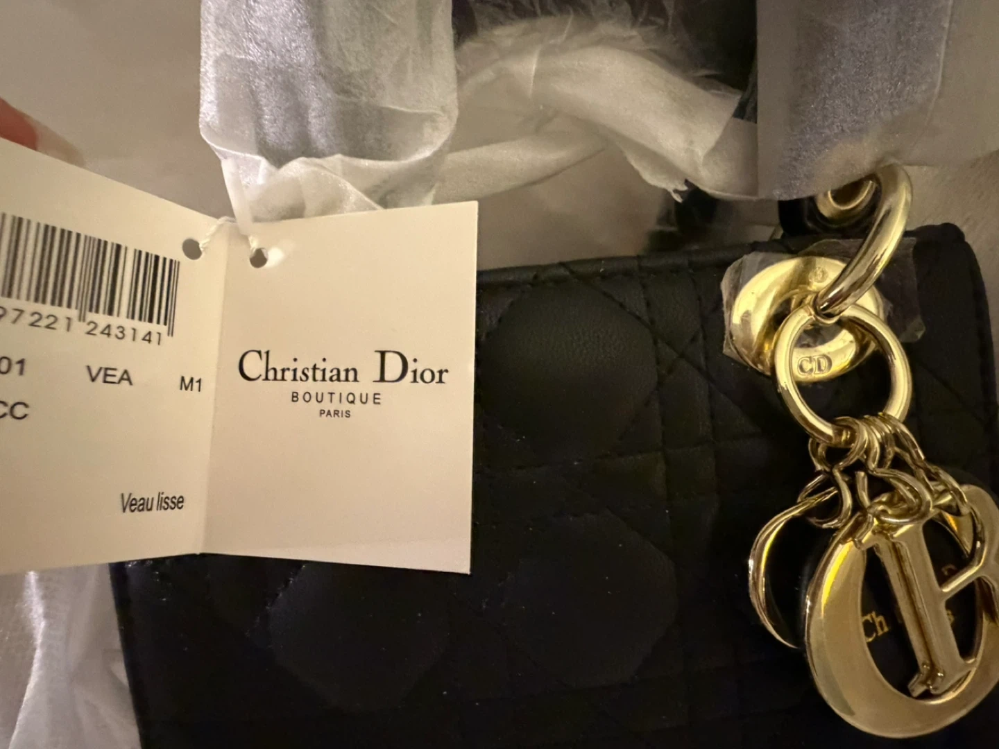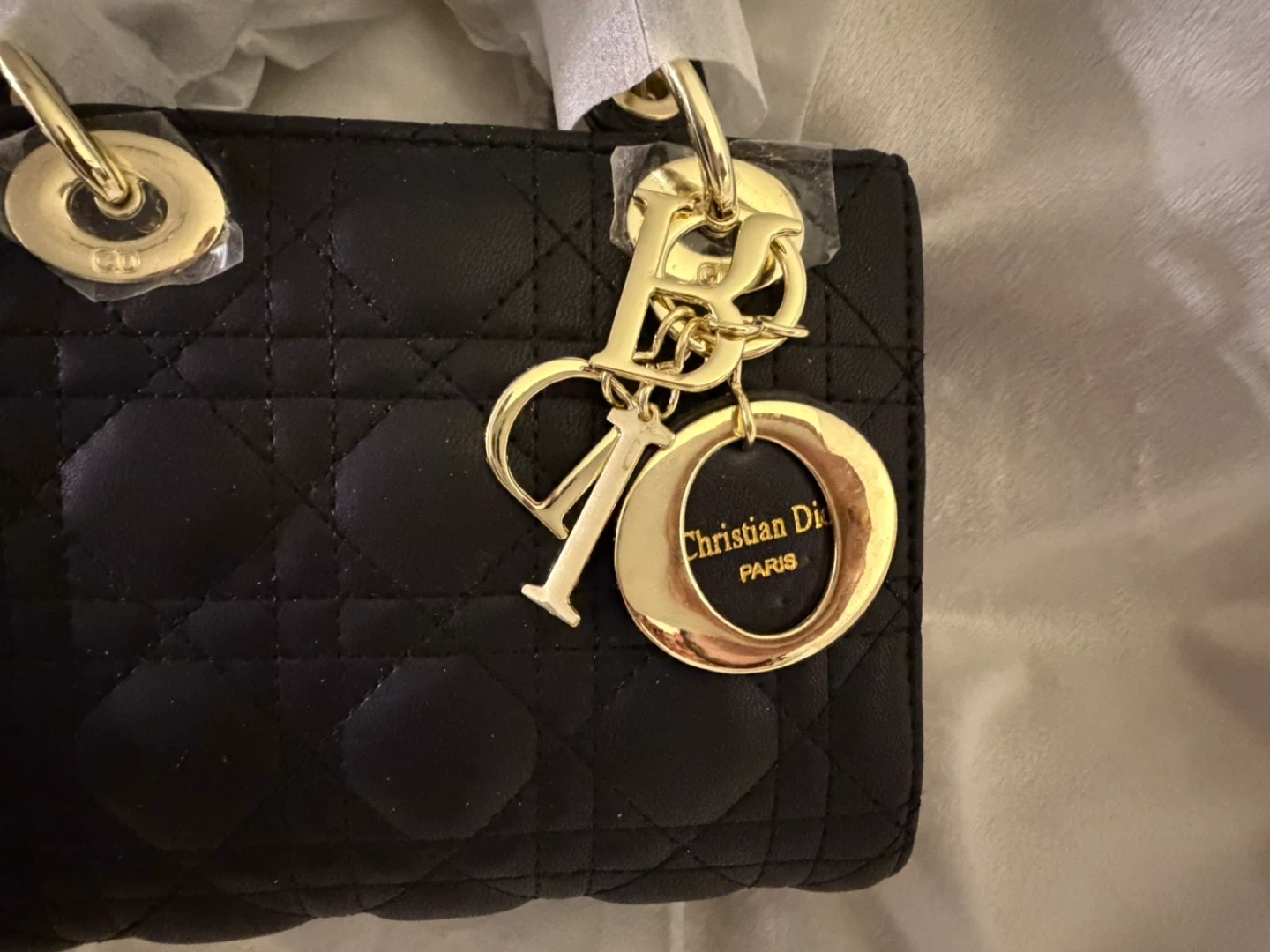 Black quilted lambskin leather handbag. Gold-tone hardware and 'D.i.o.r.' charm. Comes with authenticity tag.