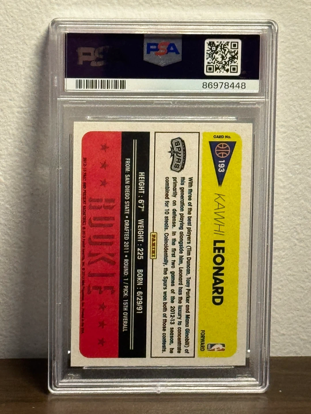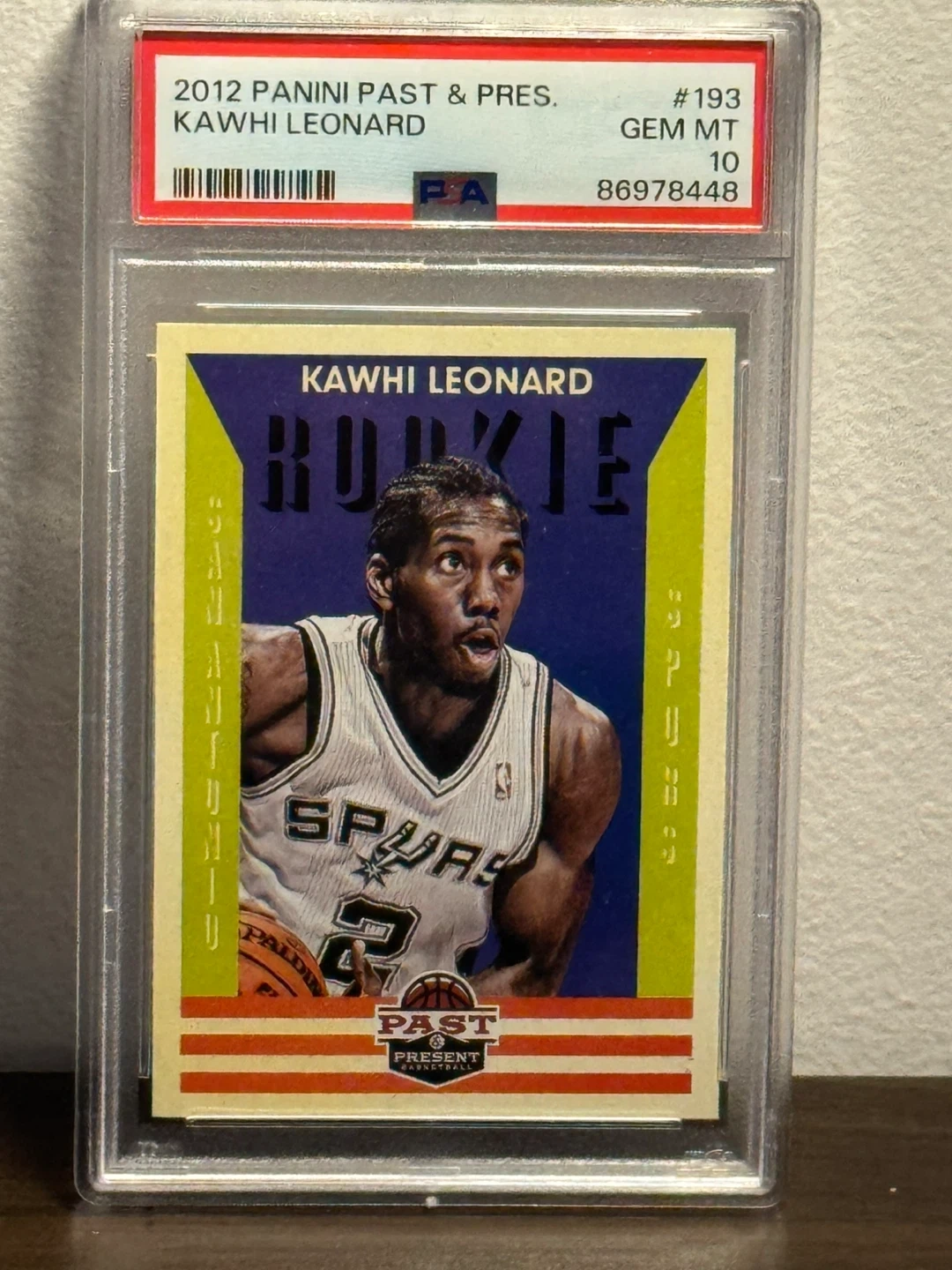 This is the 2012 Panini Past & Present Kawhi Leonard Rookie Card, serial number #193. It's graded a perfect GEM MT 10 by PSA. Features Kawhi Leonard in his Spurs uniform.