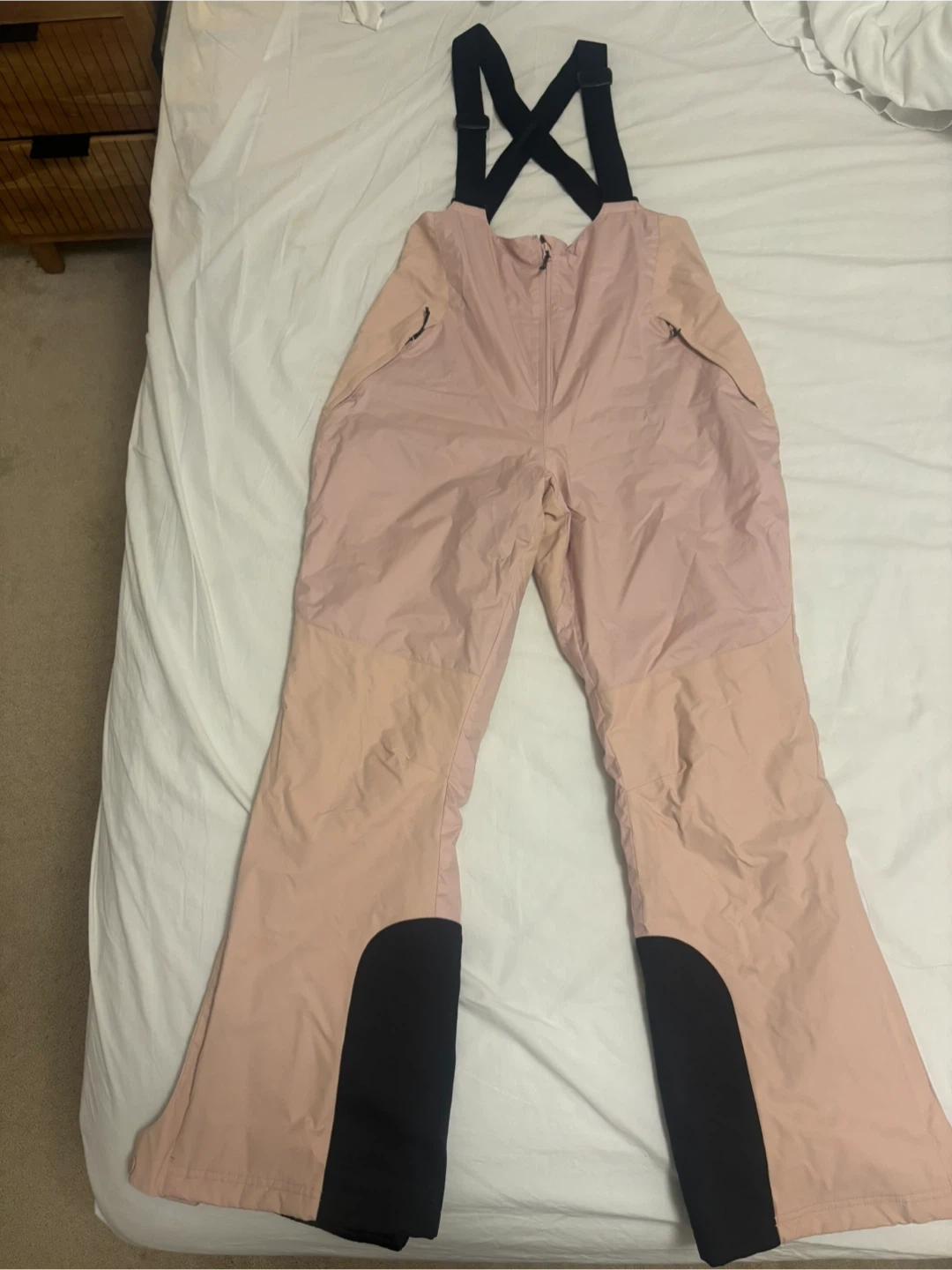 Columbia women's ski bib pants in a soft pink colour. They're a size medium with adjustable suspenders. These pants are made for outdoor winter activities.