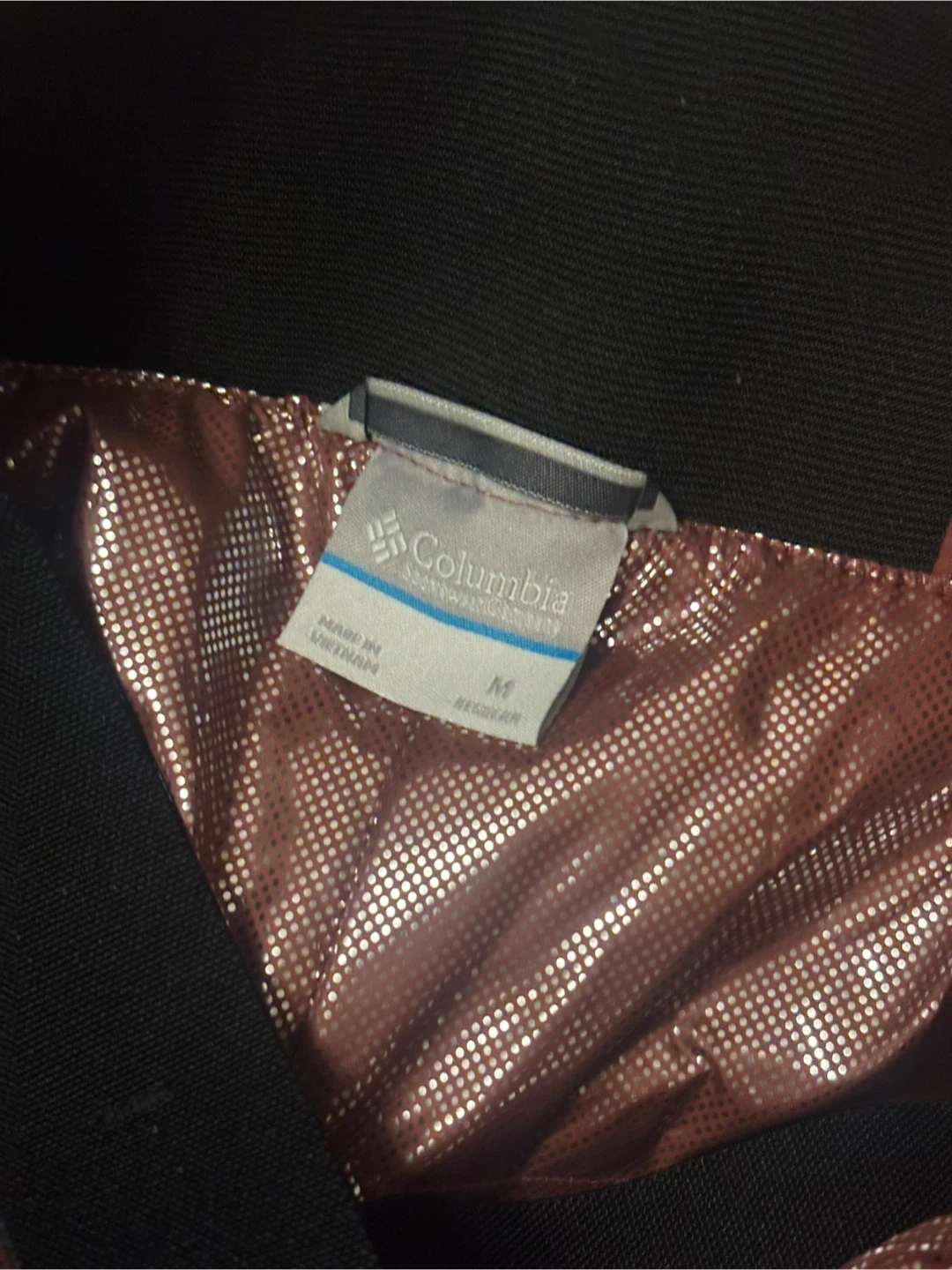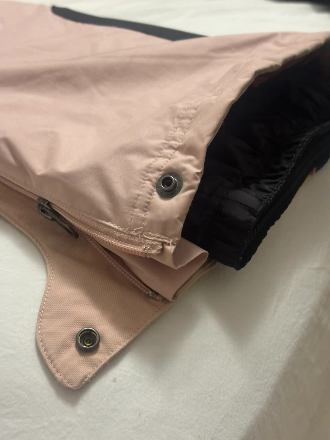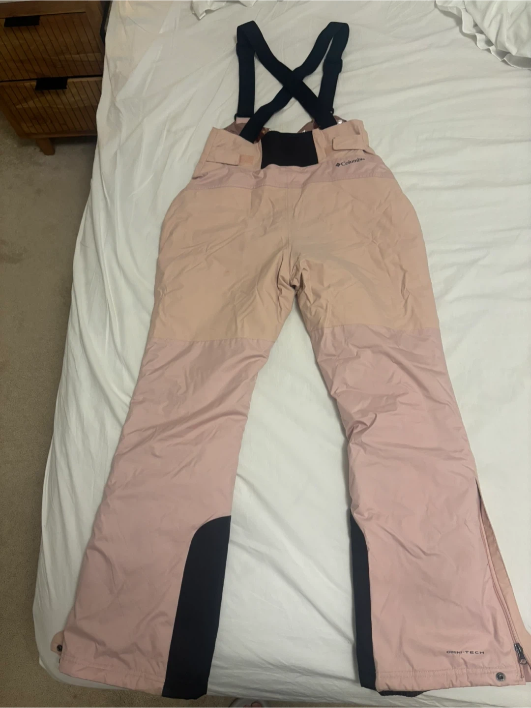Columbia women's ski bib pants in a soft pink colour. They're a size medium with adjustable suspenders. These pants are made for outdoor winter activities.