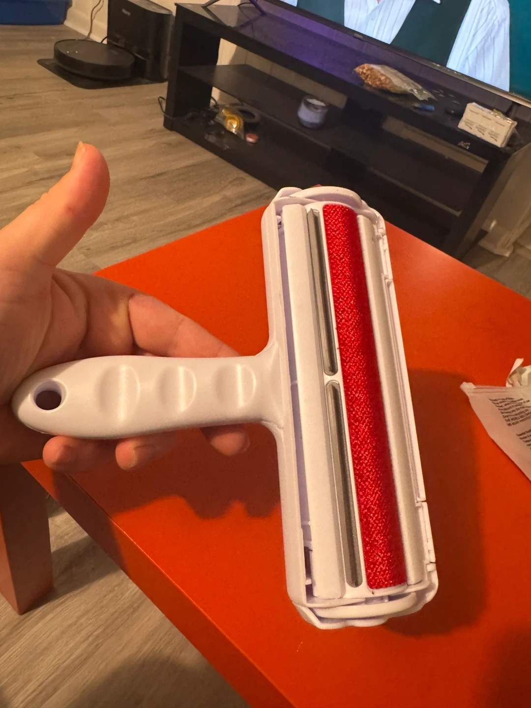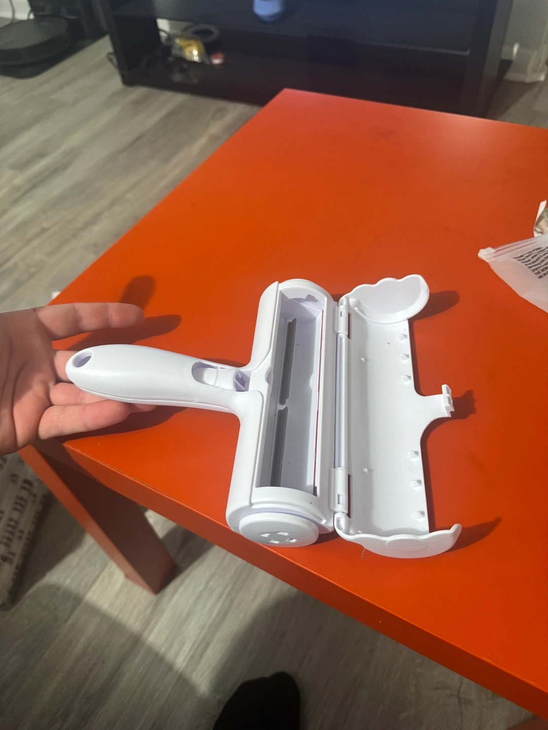 This is a rechargeable lint roller set. It comes with the main roller unit, a large cleaning brush, a smaller handheld brush, and a USB charging cable. It's great for removing pet hair and lint from fabrics!