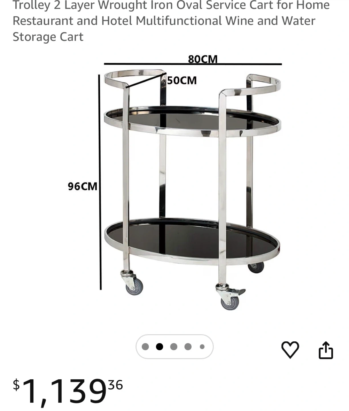 This two-tier oval service cart features a wrought iron frame and glass shelves. It has a height of 96cm, a width of 80cm, and a depth of 50cm. The cart comes with wheels for easy mobility.