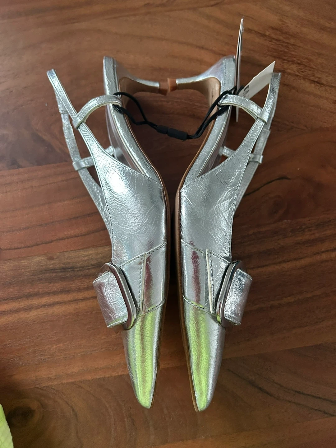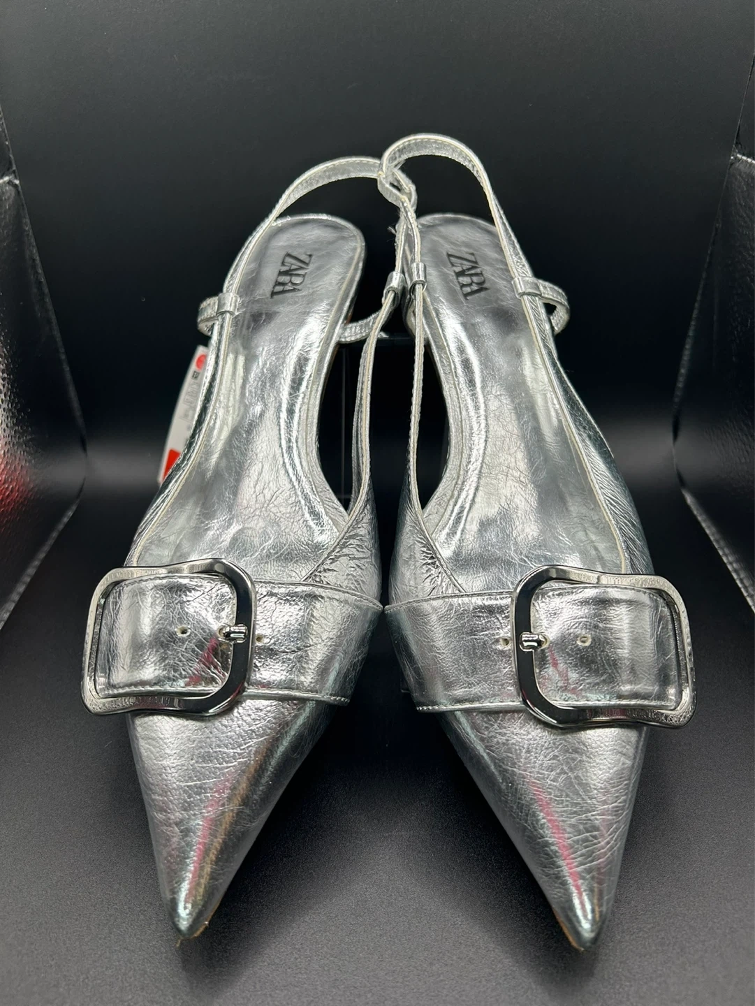 These ZARA slingback heels are a stylish silver colour. They feature a decorative buckle on the pointed toe and an adjustable ankle strap. Slingback design.