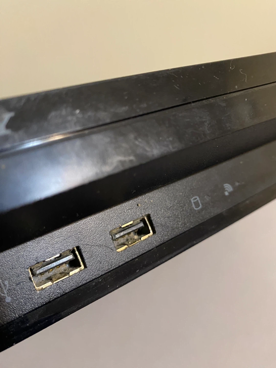 The console has some normal cosmetic wear from use, along with a bit of dust in the vents and ports, which is common for older systems and doesn’t affect performance.