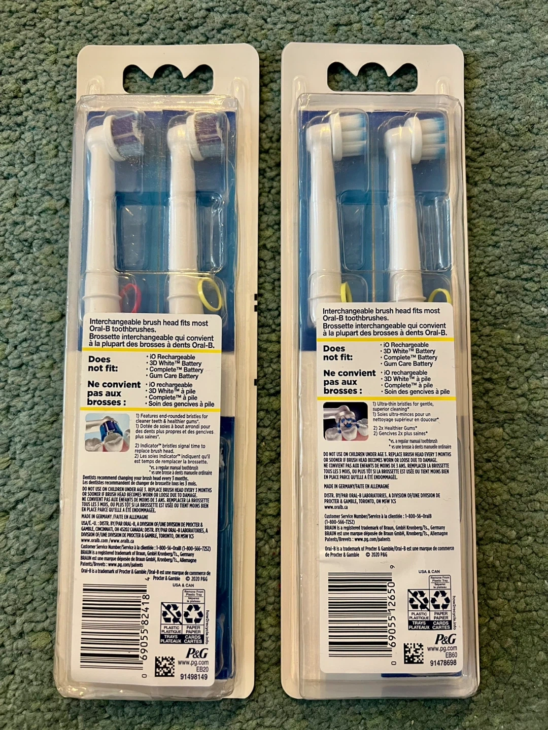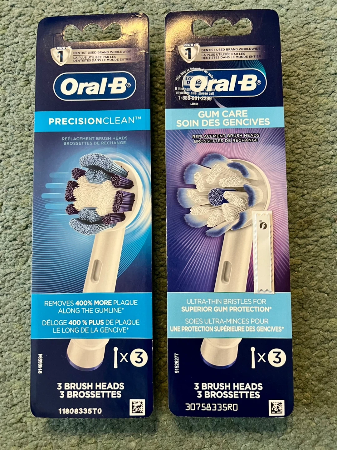 Two packs of Oral-B toothbrush heads, each containing three brush heads. One pack is PrecisionClean and the other is Gum Care. Both are designed for superior plaque removal and gum protection.