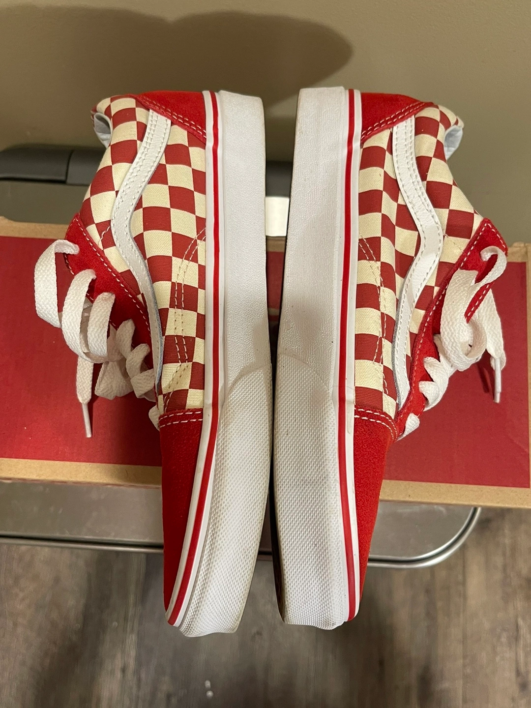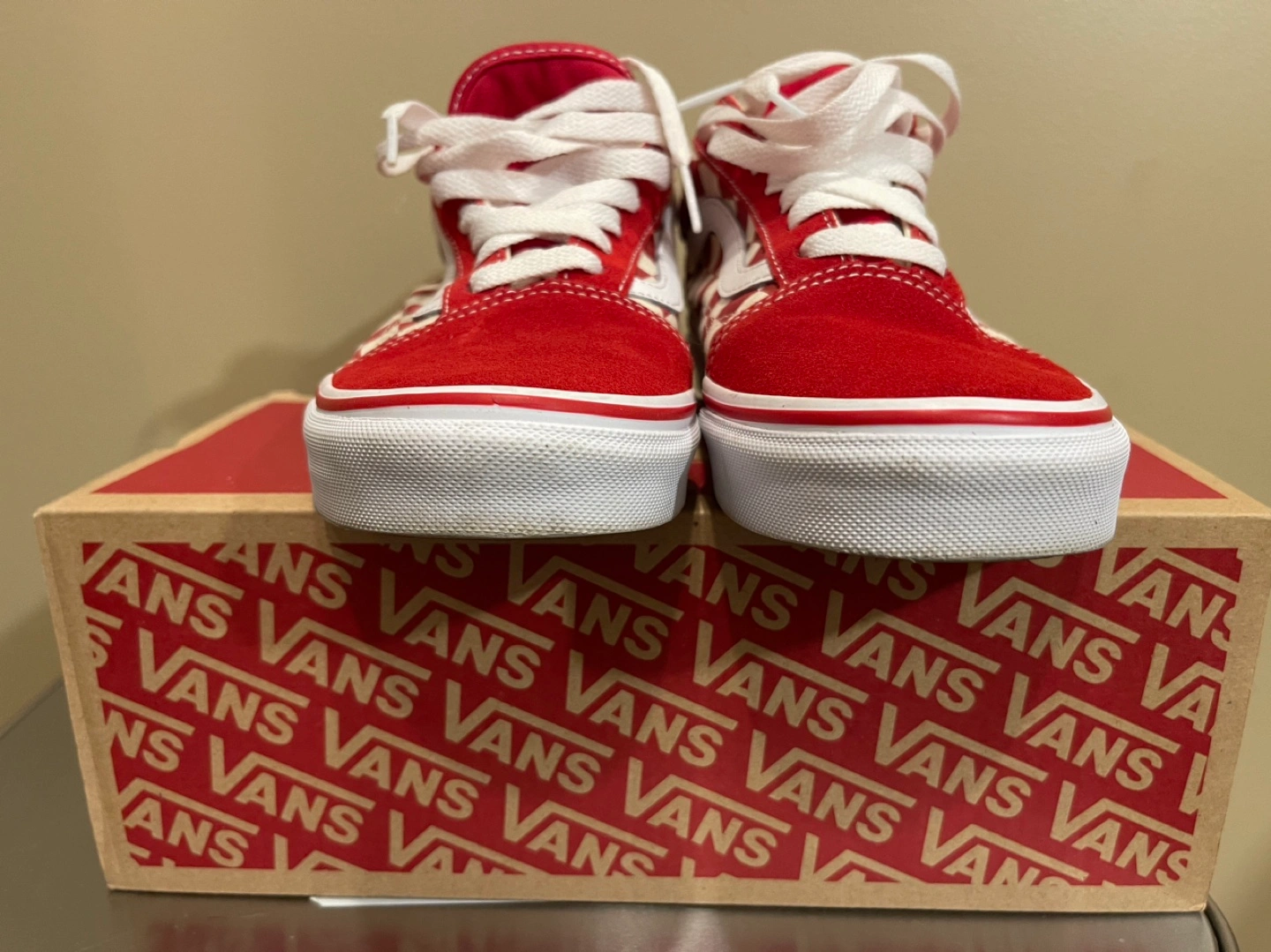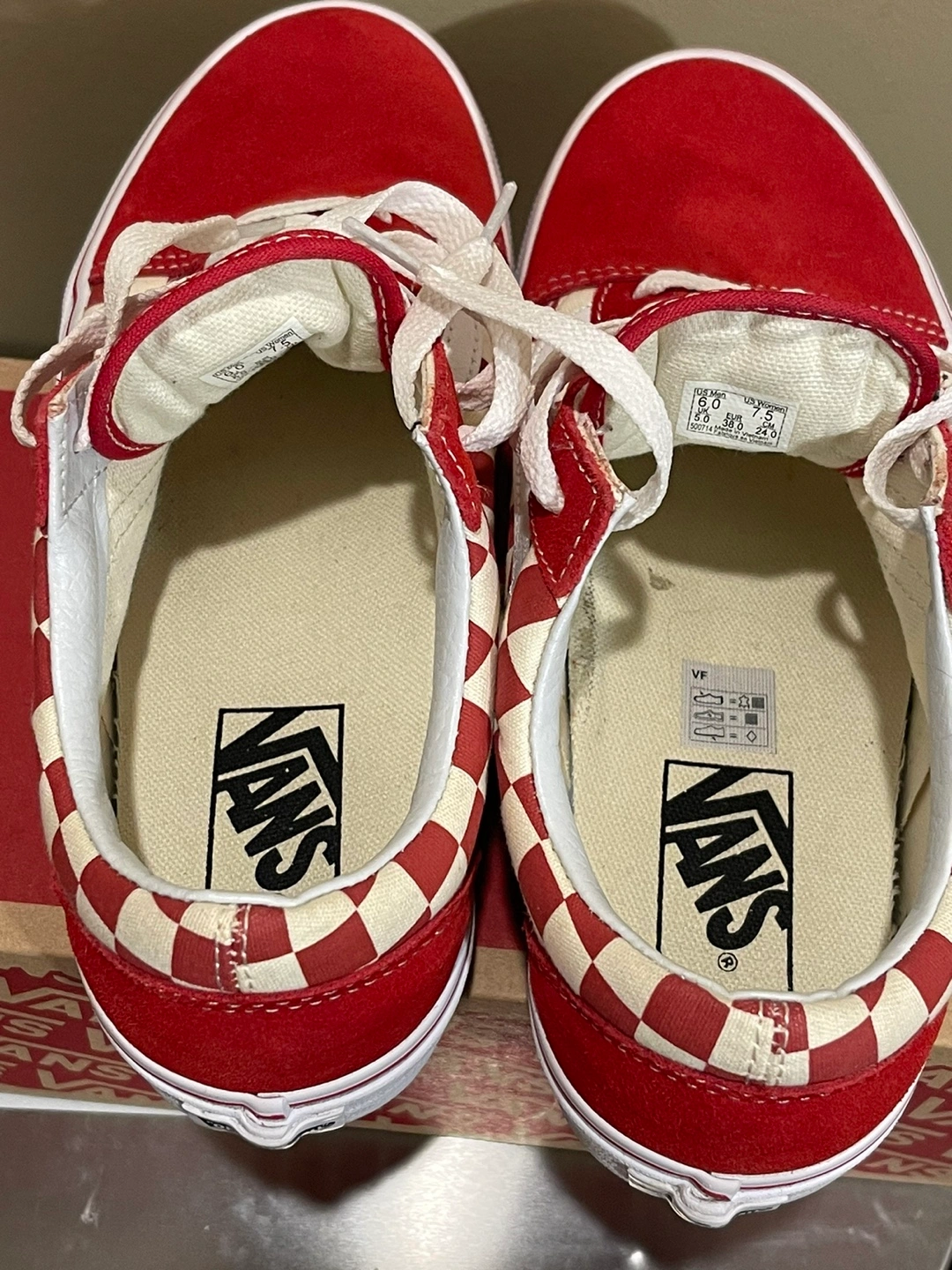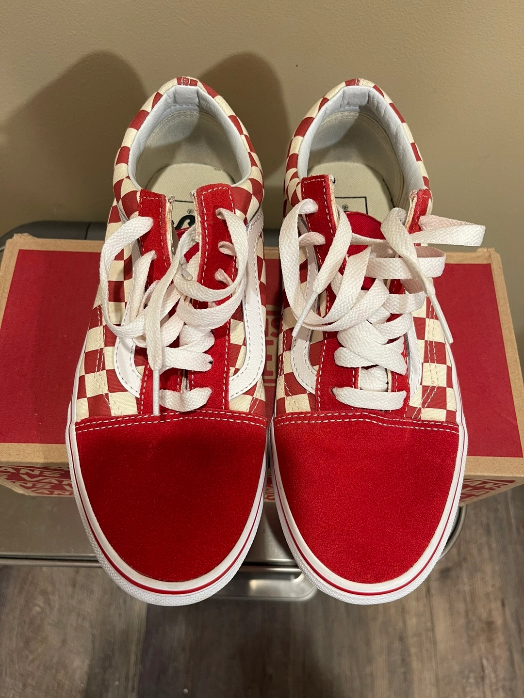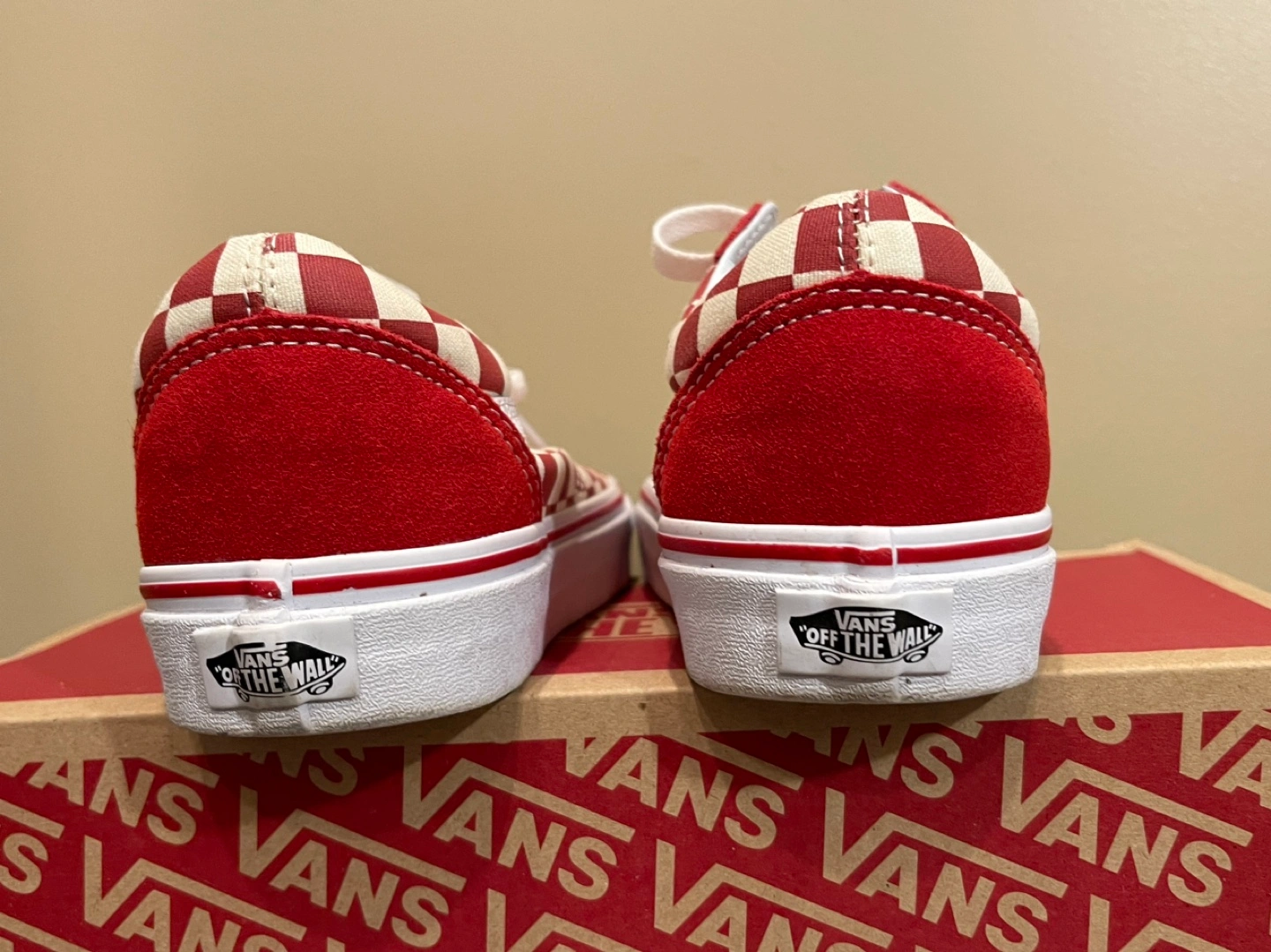 Red and white checkerboard pattern with red suede back. White laces.