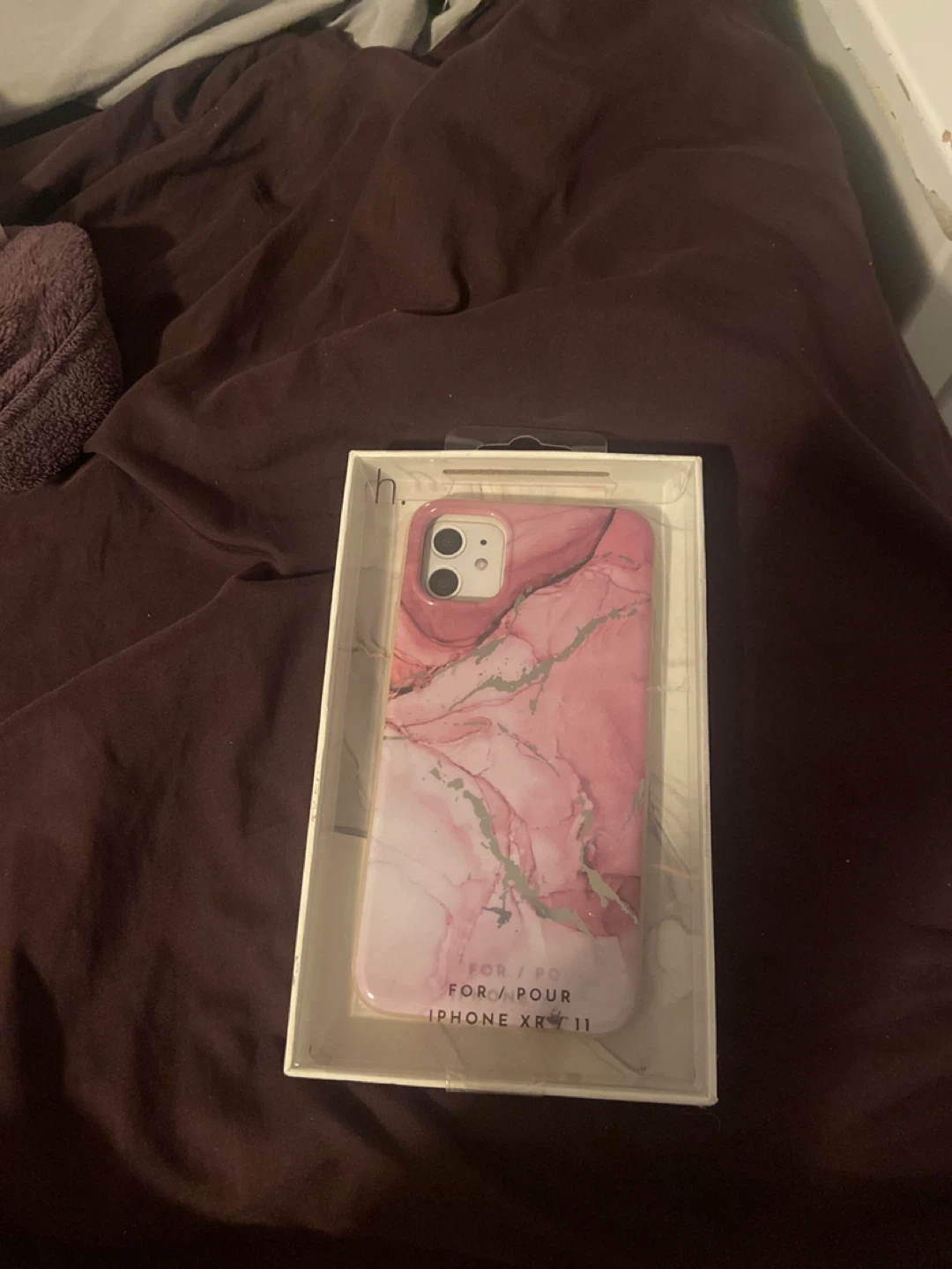 This is a pink marble patterned phone case by h. It's designed for the iPhone XR. The case comes in its original packaging.