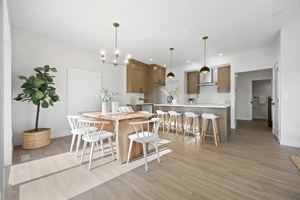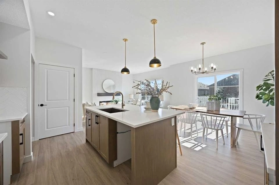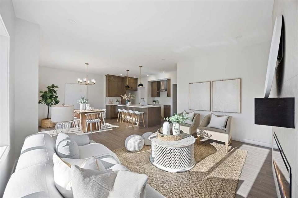Brand new front garage home in Bayview, Airdrie. 1,936 sq ft with 3 bedrooms and 2.5 bathrooms. Features a south-facing backyard, full-width deck, and walkout basement, perfect for entertaining or future development. The main floor has 9' ceilings, a modern kitchen with quartz countertops and stainless steel appliances, a fireplace, and a double attached garage. Upstairs, you'll find a bonus room, a spacious primary suite with a walk-in closet and ensuite, two additional bedrooms, a full bathroom, and upper-floor laundry. The walkout basement also has 9' ceilings. Bayview offers parks, pathways, and sports facilities for an active lifestyle year-round. Message me to book your private showing.