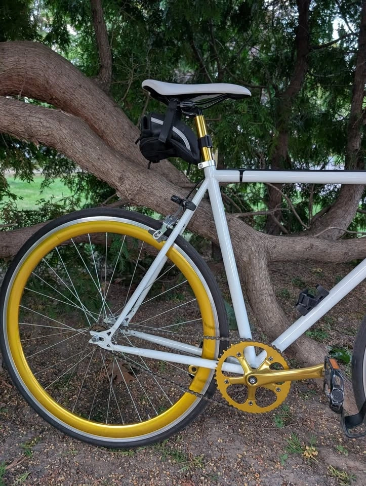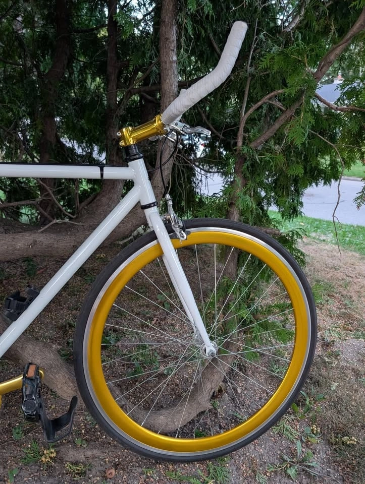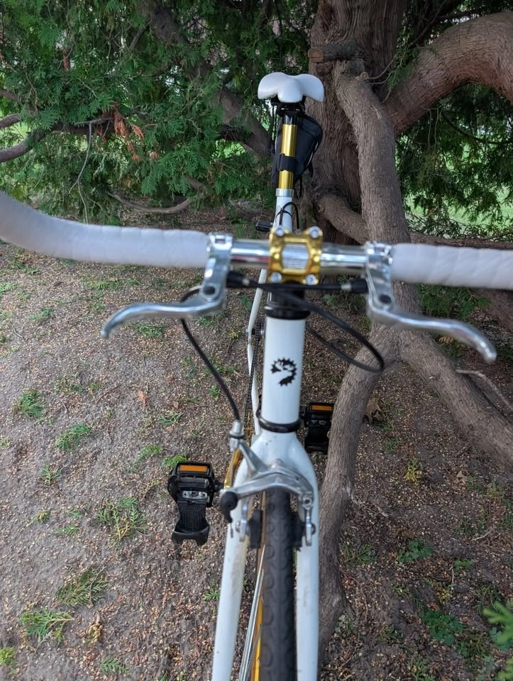 This is your new soulmate. She/He/They are the sexiest bike you've ever met. Easy on the eyes and easy on the legs with its beautiful white and gold paint job, with a single speed gear setup (can easily be made into a fixie if desired). It has a 54 cm frame. It also has a Lightweight chromoly steel frameset, which is lighter than steel and stronger than aluminum. The frame is double butted 4130 Chromoly alloy with a durable powder coat finish. The gear ratio is 46-16t, ideal for light hills and cruising on the cycling path, delivered with a 46t alloy crankset on a 16t rear cog. It features a Flip Flop rear hub, so you can choose between coaster or fixed gear. Dual Pivot brakes, front and rear, provide maximum stopping power. Don't pass this up!