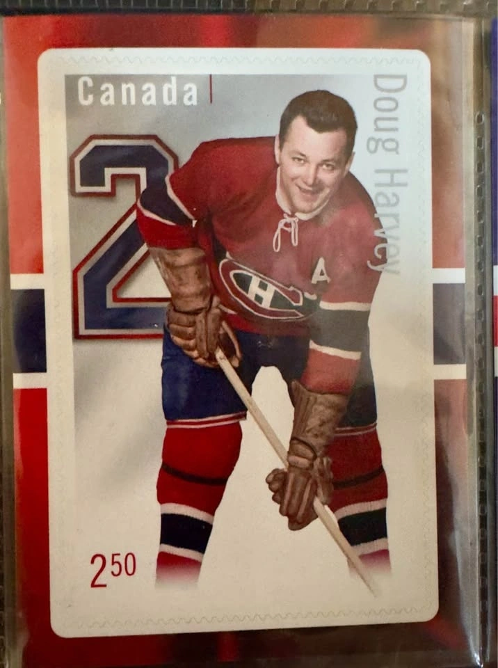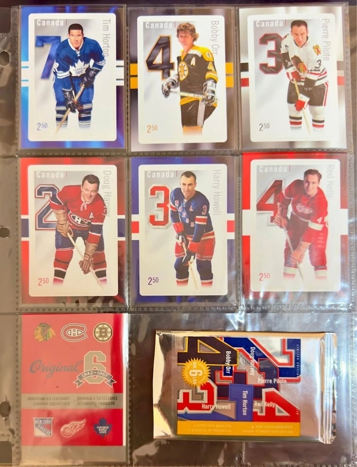This is a 2014 Canada Post Original Six Legendary Canadian Defencemen stamp booklet set. The set features stamps honoring six Hall of Fame defensemen from the NHL's Original Six era: Tim Horton, Bobby Orr, Pierre Pilote, Doug Harvey, Harry Howell, and Red Kelly. Each stamp has a face value of $2.50 Canadian. The stamps are designed to resemble hockey cards and were issued in a booklet format. The collection highlights players who dominated the sport from the 1940s to the 1960s