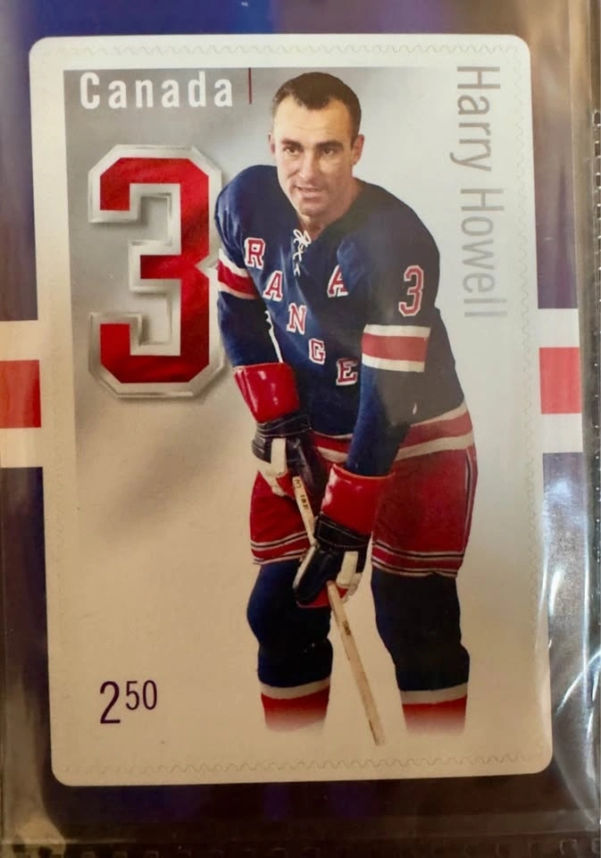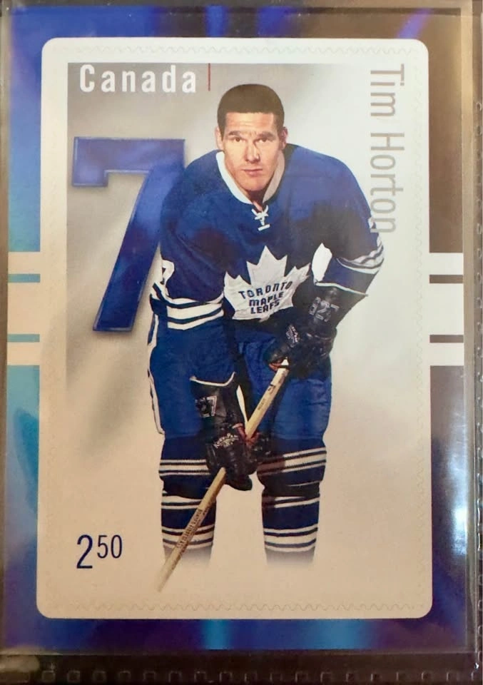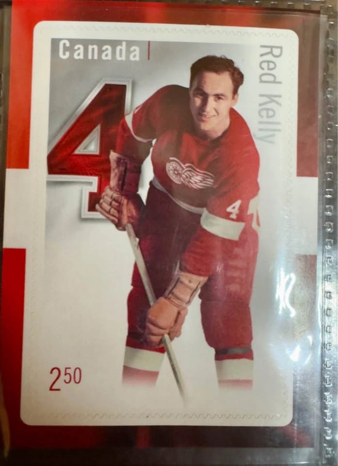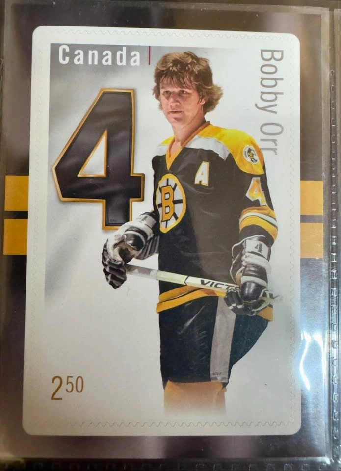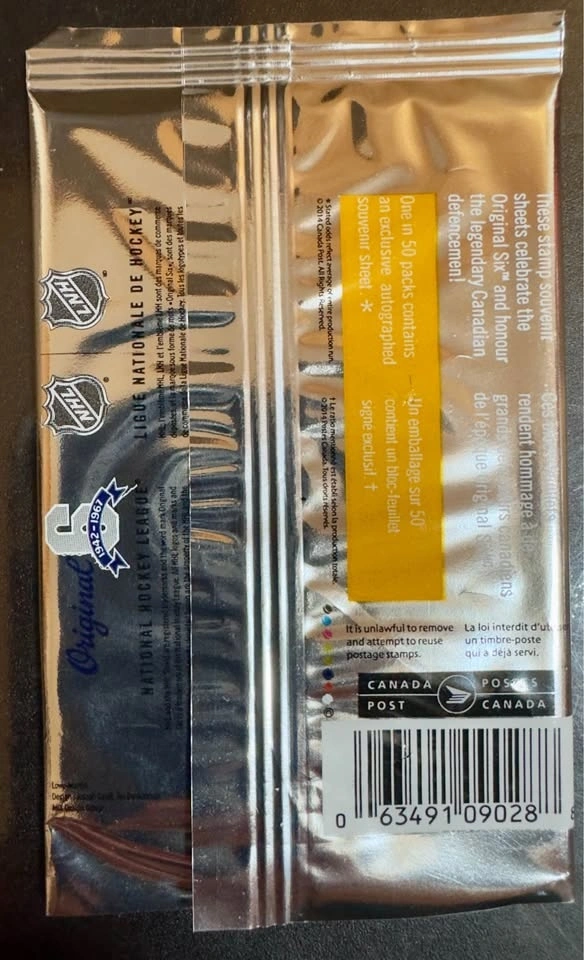 This is a 2014 Canada Post Original Six Legendary Canadian Defencemen stamp booklet set. The set features stamps honoring six Hall of Fame defensemen from the NHL's Original Six era: Tim Horton, Bobby Orr, Pierre Pilote, Doug Harvey, Harry Howell, and Red Kelly. Each stamp has a face value of $2.50 Canadian. The stamps are designed to resemble hockey cards and were issued in a booklet format. The collection highlights players who dominated the sport from the 1940s to the 1960s