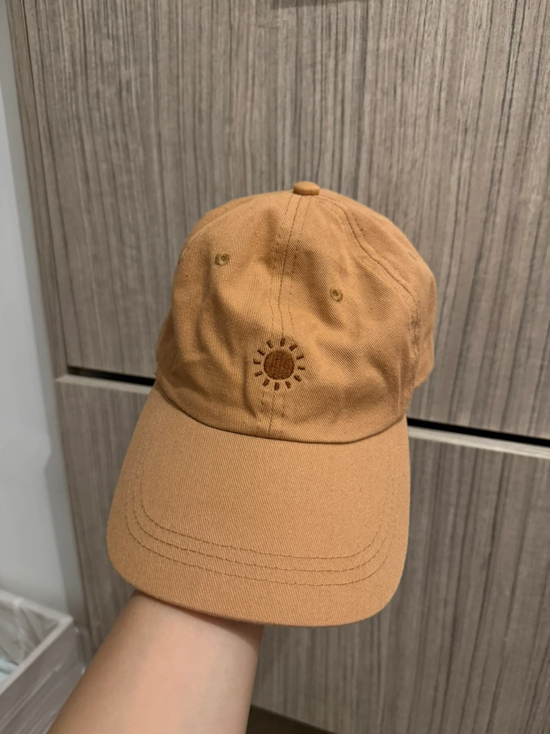This is a casual baseball cap in a nice orange hue. It's made of cotton and features a small embroidered sun on the front. The cap has an adjustable strap at the back for a good fit. It's a great accessory for sunny days!
