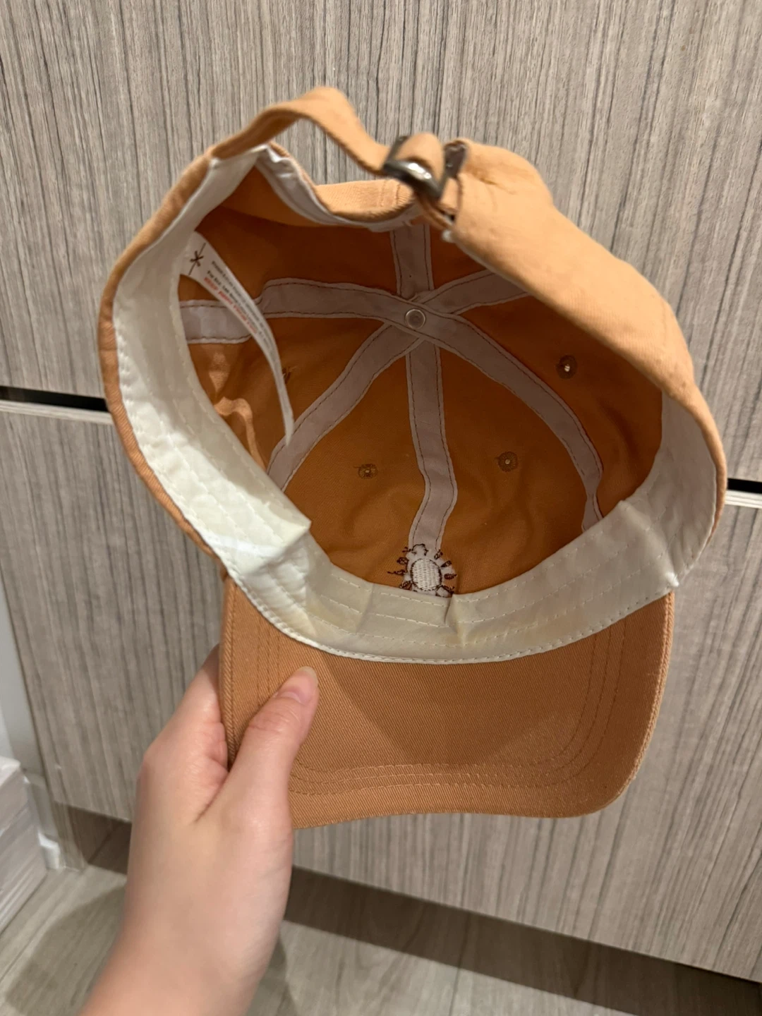 This is a casual baseball cap in a nice orange hue. It's made of cotton and features a small embroidered sun on the front. The cap has an adjustable strap at the back for a good fit. It's a great accessory for sunny days!