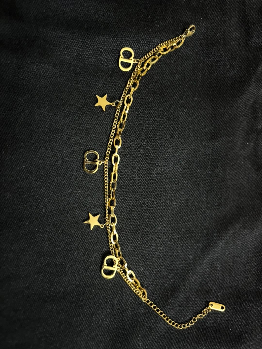 This is a double chain bracelet with CD logo charms and star charms. It's gold toned and has a clasp closure. Great for layering or wearing on its own!