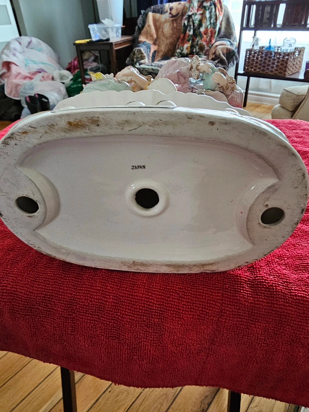 This is a lovely vintage porcelain figurine featuring a couple adorned with flowers. It's a decorative piece with intricate details on their clothing and the basket of flowers. The figurine is marked "JAPAN" on the bottom.