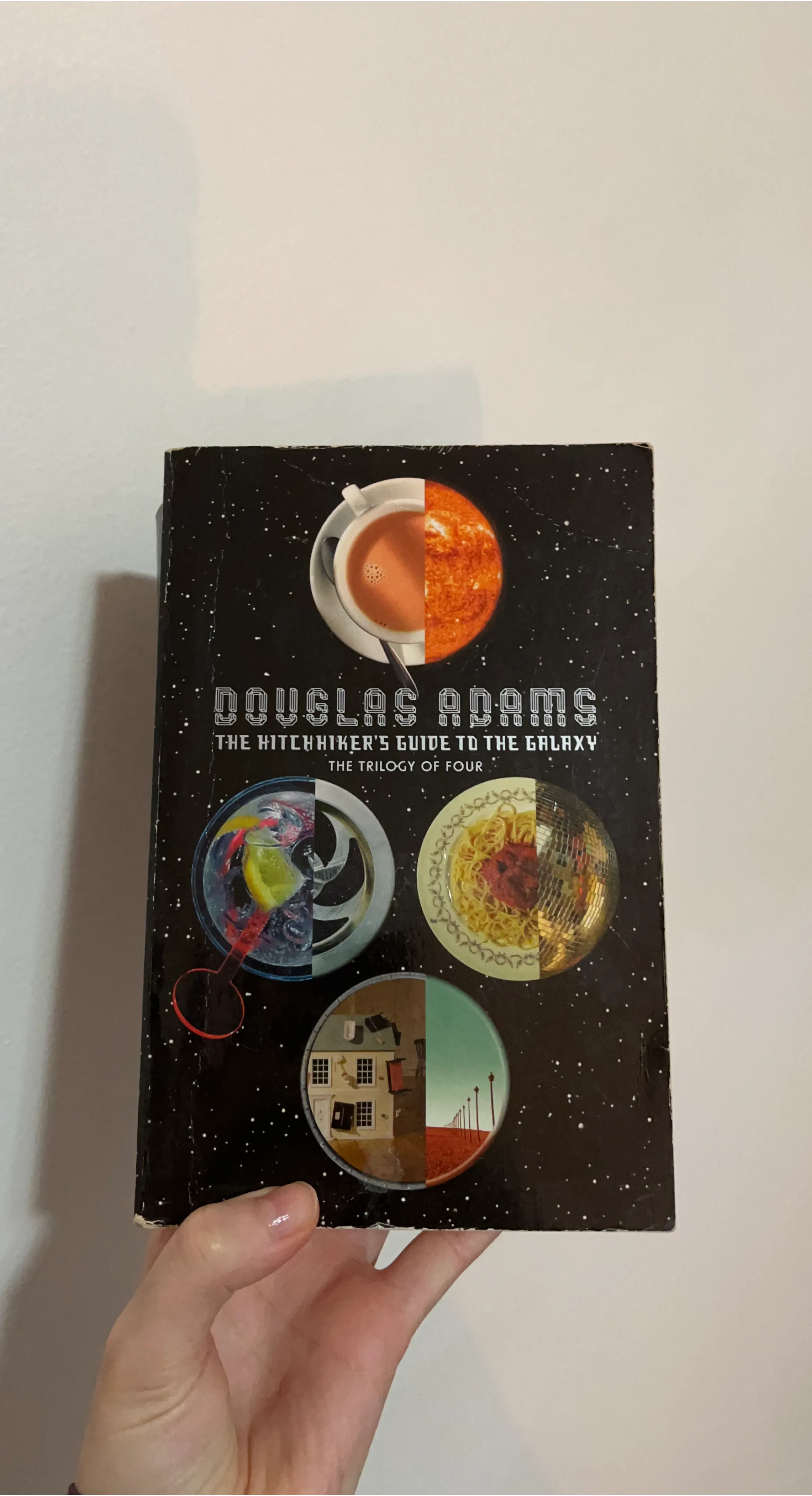 This is The Hitchhiker's Guide to the Galaxy: The Trilogy of Four by Douglas Adams. It contains "The Hitchhiker's Guide to the Galaxy", "The Restaurant at the End of the Universe", and "Life, the Universe and Everything". It also includes "So Long, and Thanks for All the Fish". It's a paperback book.